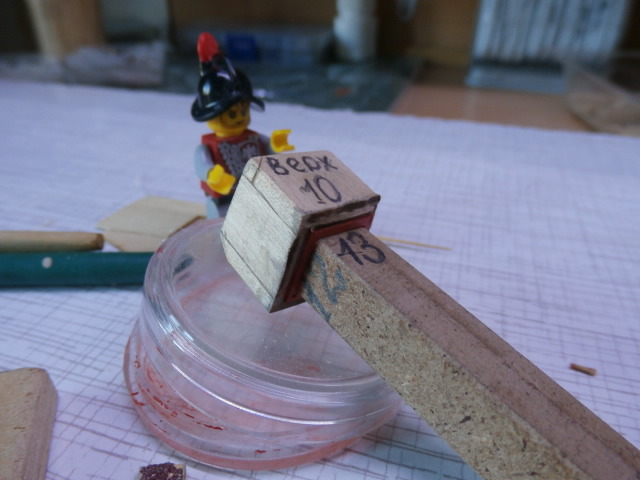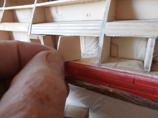 На борту модели я, как трамвайные пути наклеил 9мм бруски дерева, закрепленные на клей и нагеля- зубочистки между шпангоутами. Эти бруски в будущем помогут мне надежно закрепить площадки-руслени всех трех мачт моего корабля. Толщину брусков, я подогнал так , что сохраняя обговоренные размеры арт порта 12 Х 13мм ( размеры ДеА) мои порты будут изготовлены из 3мм по толщине, ученических угольников и эти порты "в натяг" будут входить на своё место между брусками. Эти же бруски будут дополнительной жесткостью в сооружении черновой обшивки модели. Заготовку портов я склеил из напиленных полосок от ученического треугольника. Для удобства работы при склеивании я изготовил дер. брусок со сторонами в 12 Х 13 мм. Он мне существенно помогает в работе. Для экономии материала заготовку я не стал распиливать на многочисленные заготовки портов гон-дека. Заготовку вставляю в предназначенное ей место , отпиливаю от заготовки порт . С внутренней стороны вставляю заглушку. 2мм сверлом сверлю в середине отверстие , для того что бы в будущем закрепив 2мм зубочистку, куда будет надет ствол фальш-орудия от ДеА.