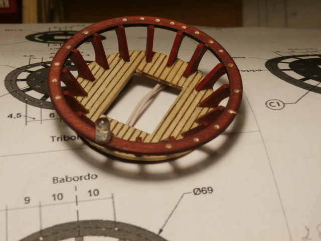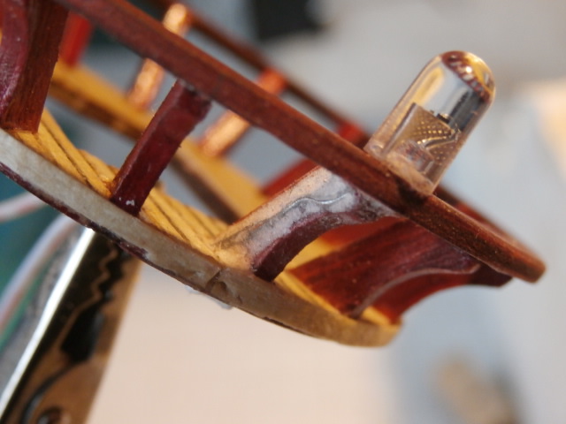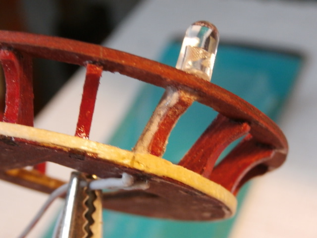 В прошлых постах я уже писал о том, что запланировал на (Фок и Грот мачтах) модели установить два фонаря на нижних марсовых площадках. Я собирался установить в "Вороньем гнезде" металлические фонарики от декоративных брелоков. Но при нашем масштабе сооружать действующий фонарь сложно. Слишком мало места внутри брелока. Не стал я испытывать судьбу и просверлив два 0,5 мм отверстия в планшире "Вороньего гнезда" пропустив выводы светодиода и наклеив все, в том числе выводы и корпус светодиода на секундный клей я получил такого рода имитацию корабельного фонаря. Должен сказать, что корпус светодиода миниатюрен (5 Х 6 мм.) Свет от него очень слаб. (Он работает как заженная свеча то потухая, то ярко вспыхивая желтым светом.) В окружении парусов и такелажа, думаю его форма не будет уж сильно заметная для зрителей и не так критична! Оба вывода я наклеил с обоих сторон кормовой стойки планширя на секундный клей, а затем нанес шпатлевку. В окончательном варианте стойку вместе с выводами я закрашу под цвет самого гнезда. Покупать или сооружать корабельные фонари на такой миниатюрной площадке , по моему убеждению будет грубо,( на уровне детской игрушечной кареты.)