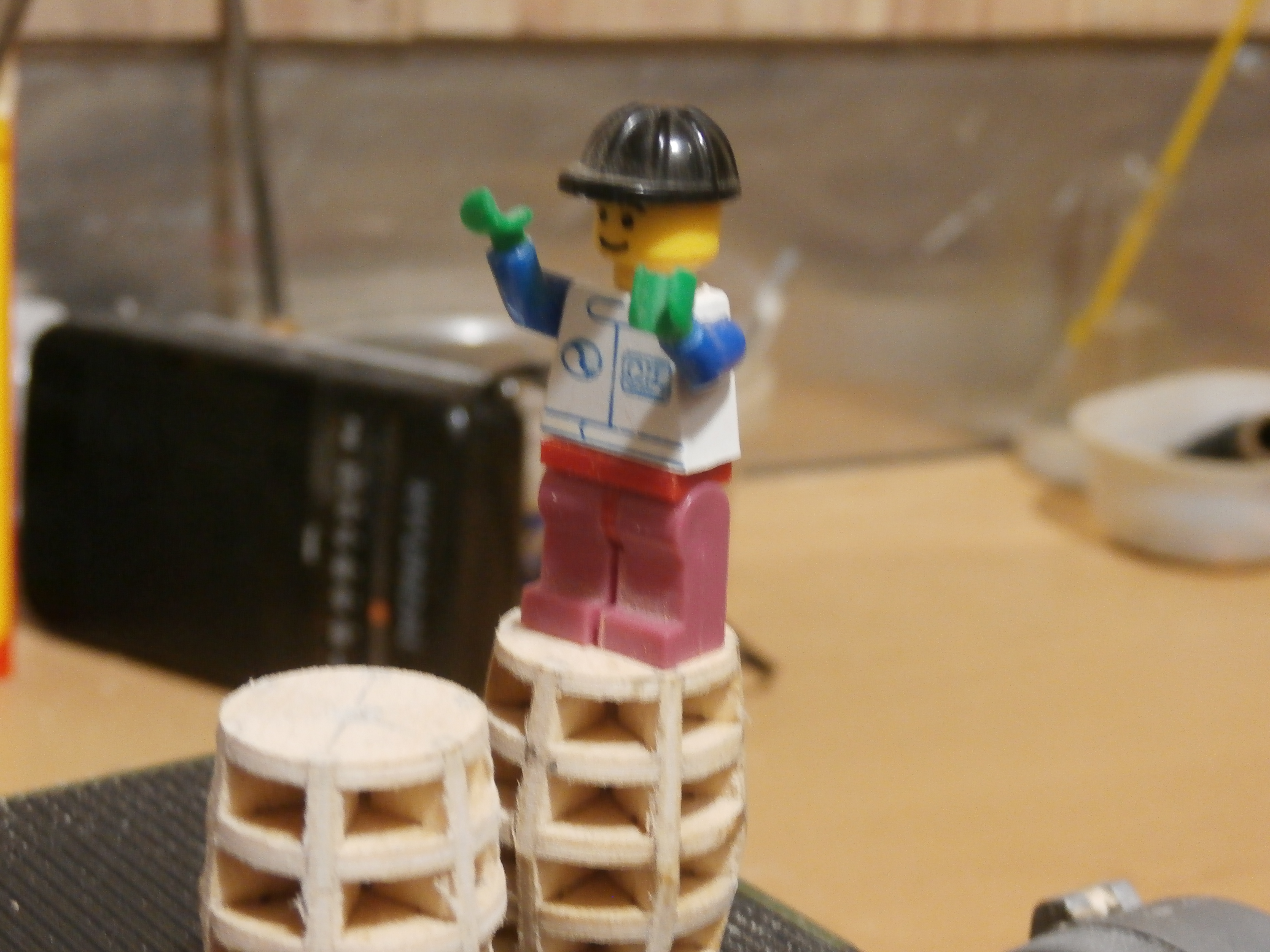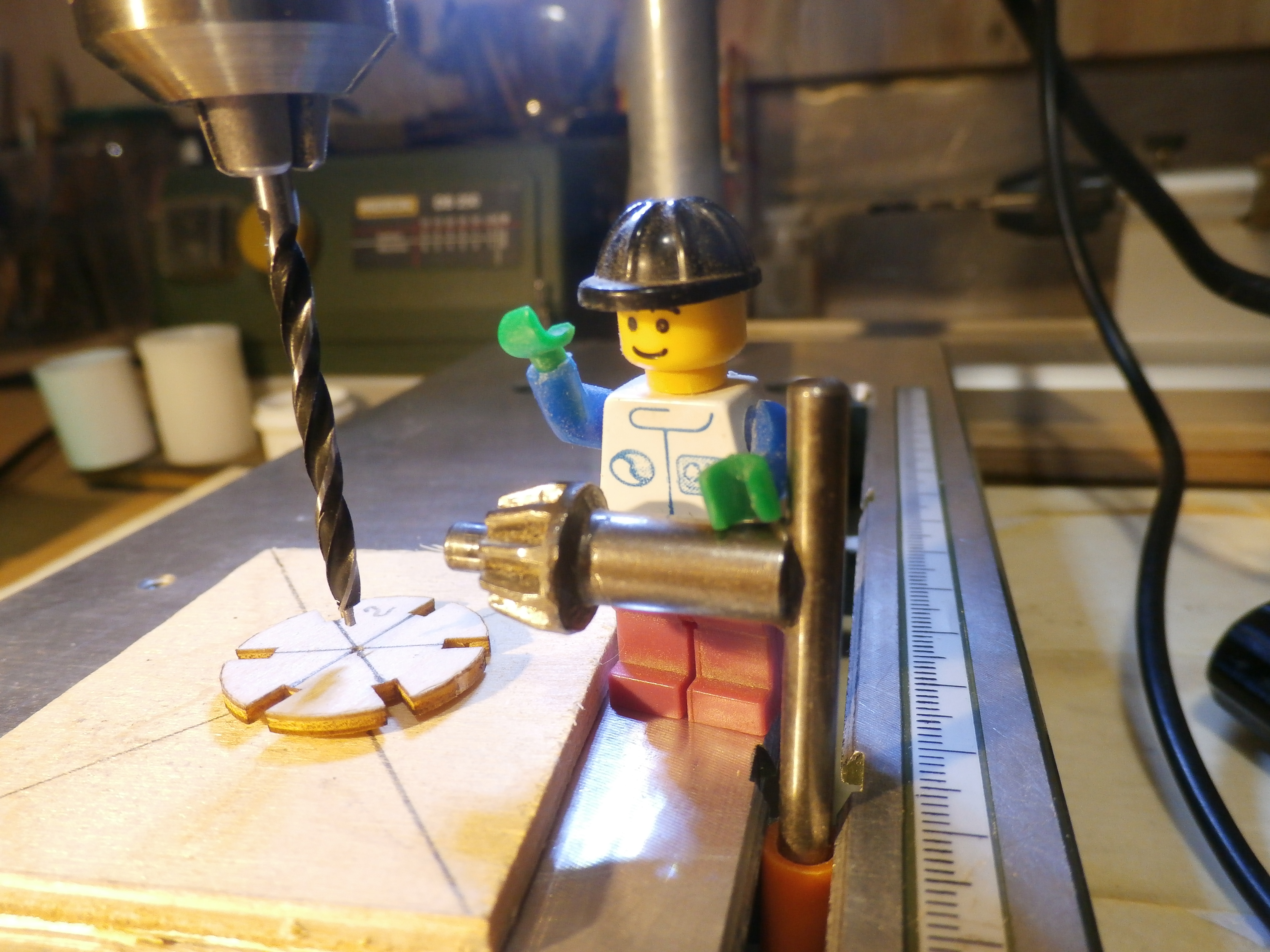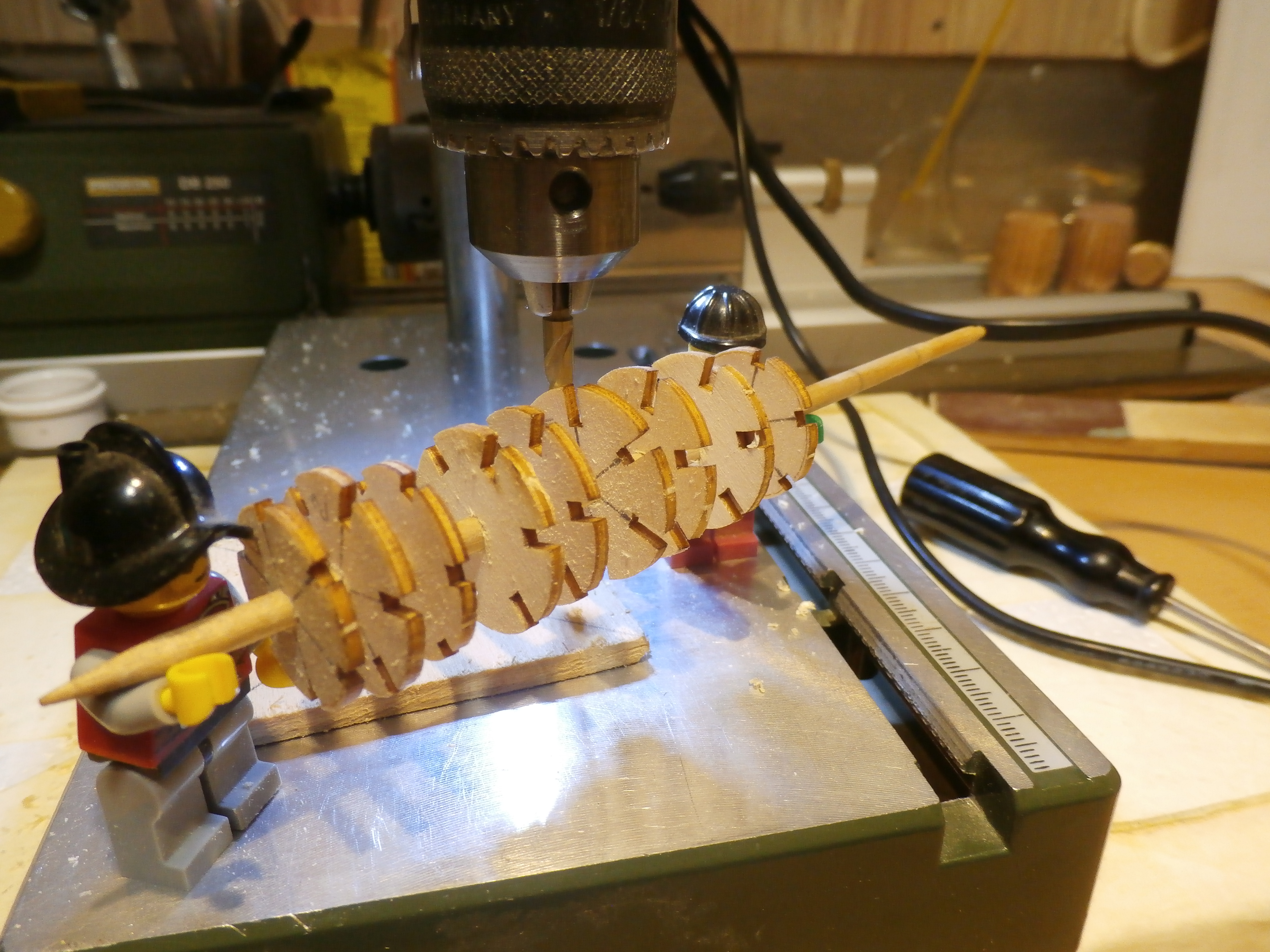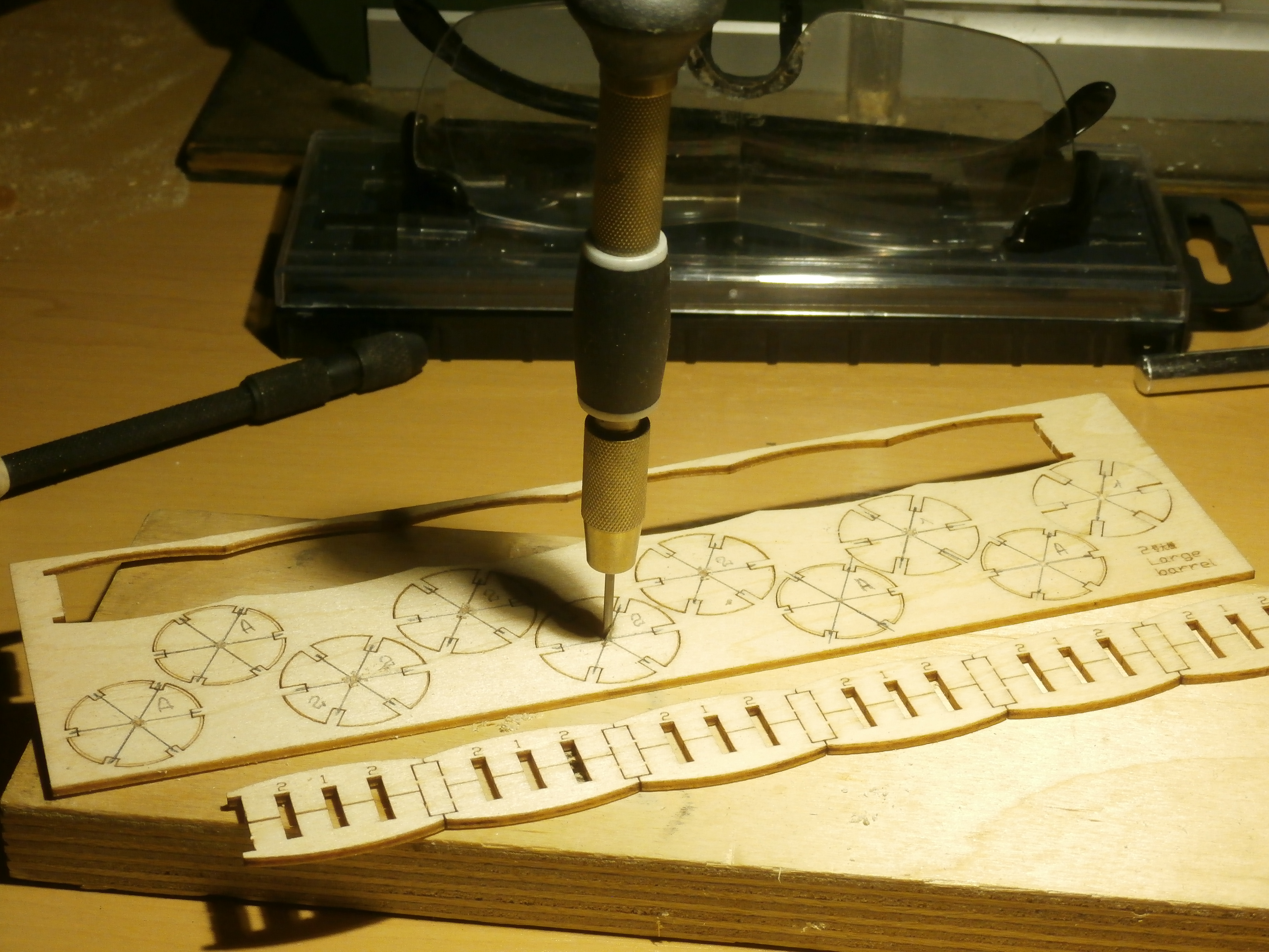 -Вырезаем из фанерной матрицы детали силового каркаса будущей бочки. И сразу косяк! Фанера по-сути рыхлая и каркас получается довольно слабым, по этому собирать и склеивать "на коленке" каркас нельзя! Нужен какой либо кондуктор.Подумав решил в поперечных деталях сил.каркаса сверлить отверстия на 3мм, что бы при сборке вставить сил.ось в середине бочки, в виде 3 мм бамбукового шампура. Для правильной фиксации каркаса во время кристаллизации клея подобрал пл. флакон из под таблеток.