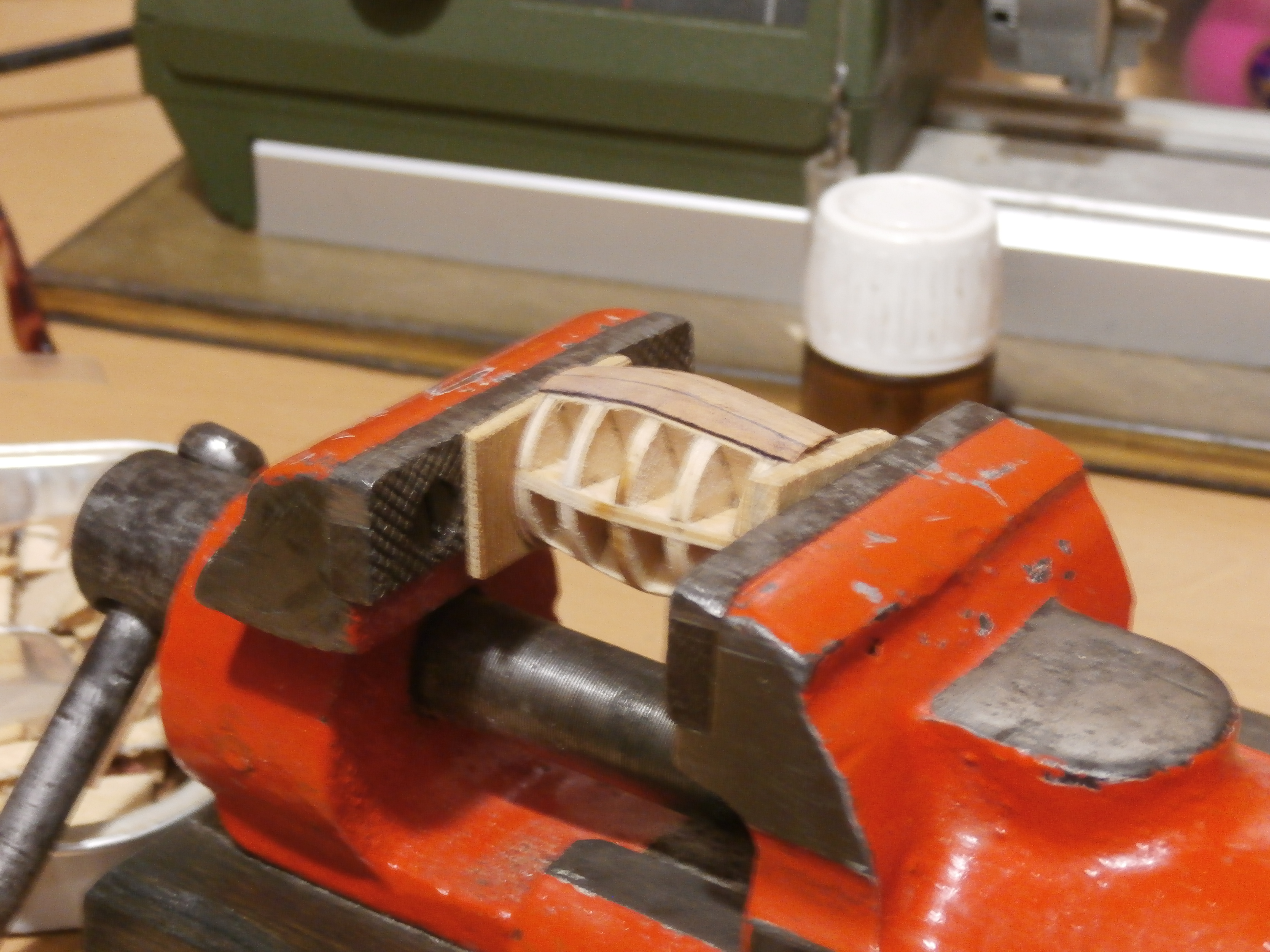 Начинаю чистовую обшивку бочки с вклеивания днища бочки шпоном вишни, а затем и боковых клепиков бочки.