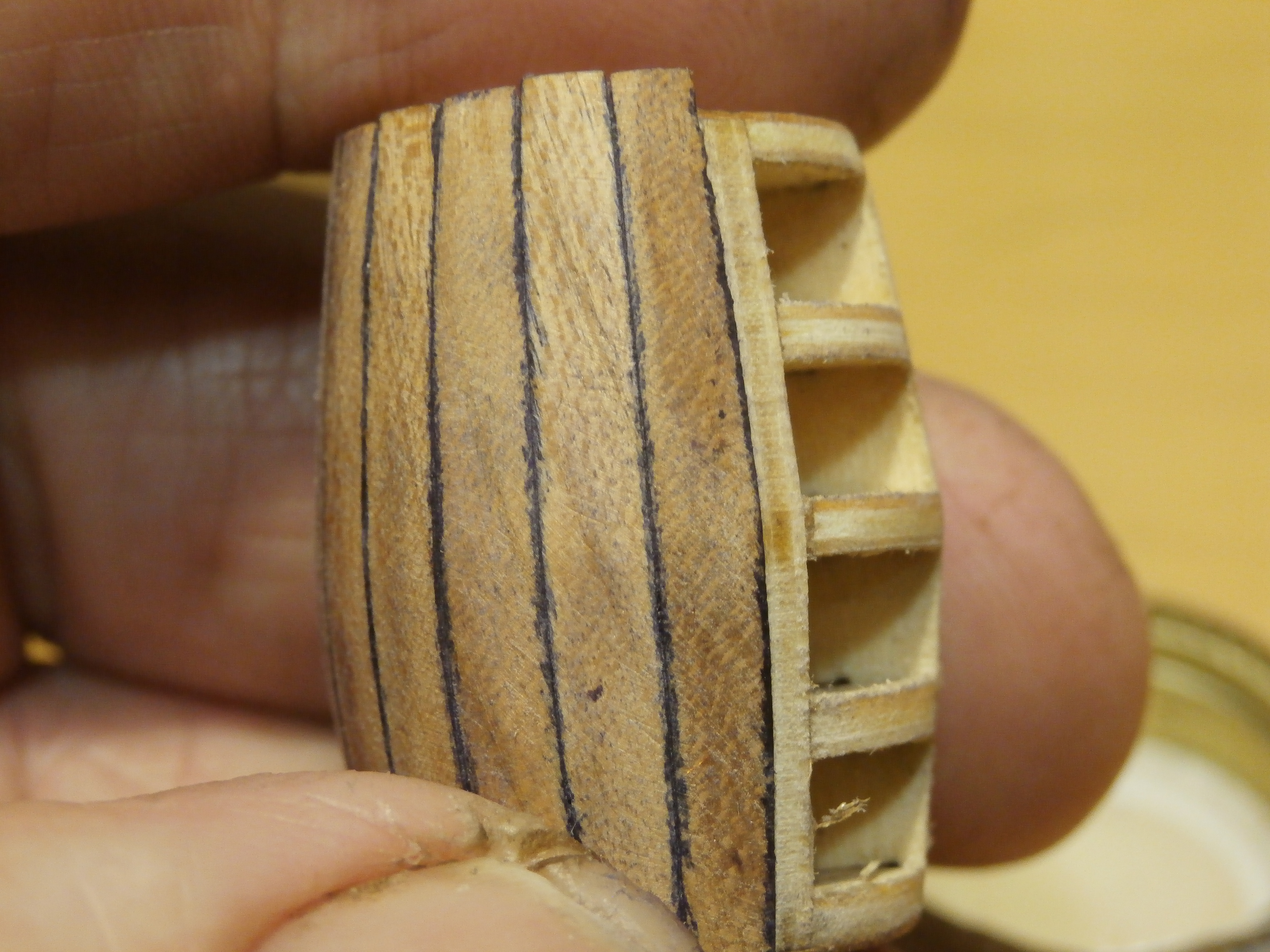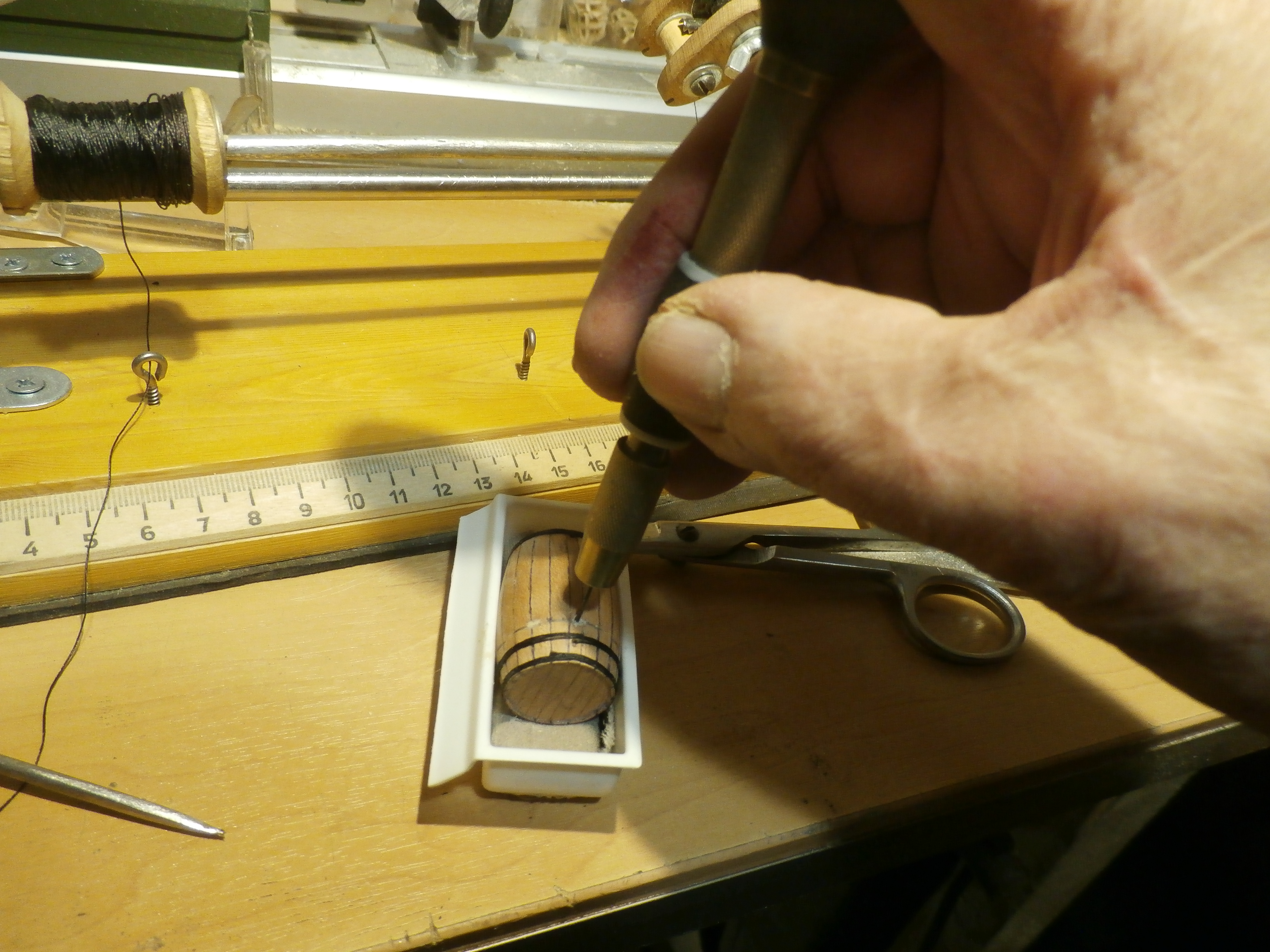 И хотя клепки в бочке ни кто не конопатит и не смолят. Герметичность достигается тщательным обтачиванием боков клепок, но в моделизме все же более убедительней и жизнено вариант с маркером. Хотя впрочем это на мой взгляд. Возможно , я ошибаюсь...
