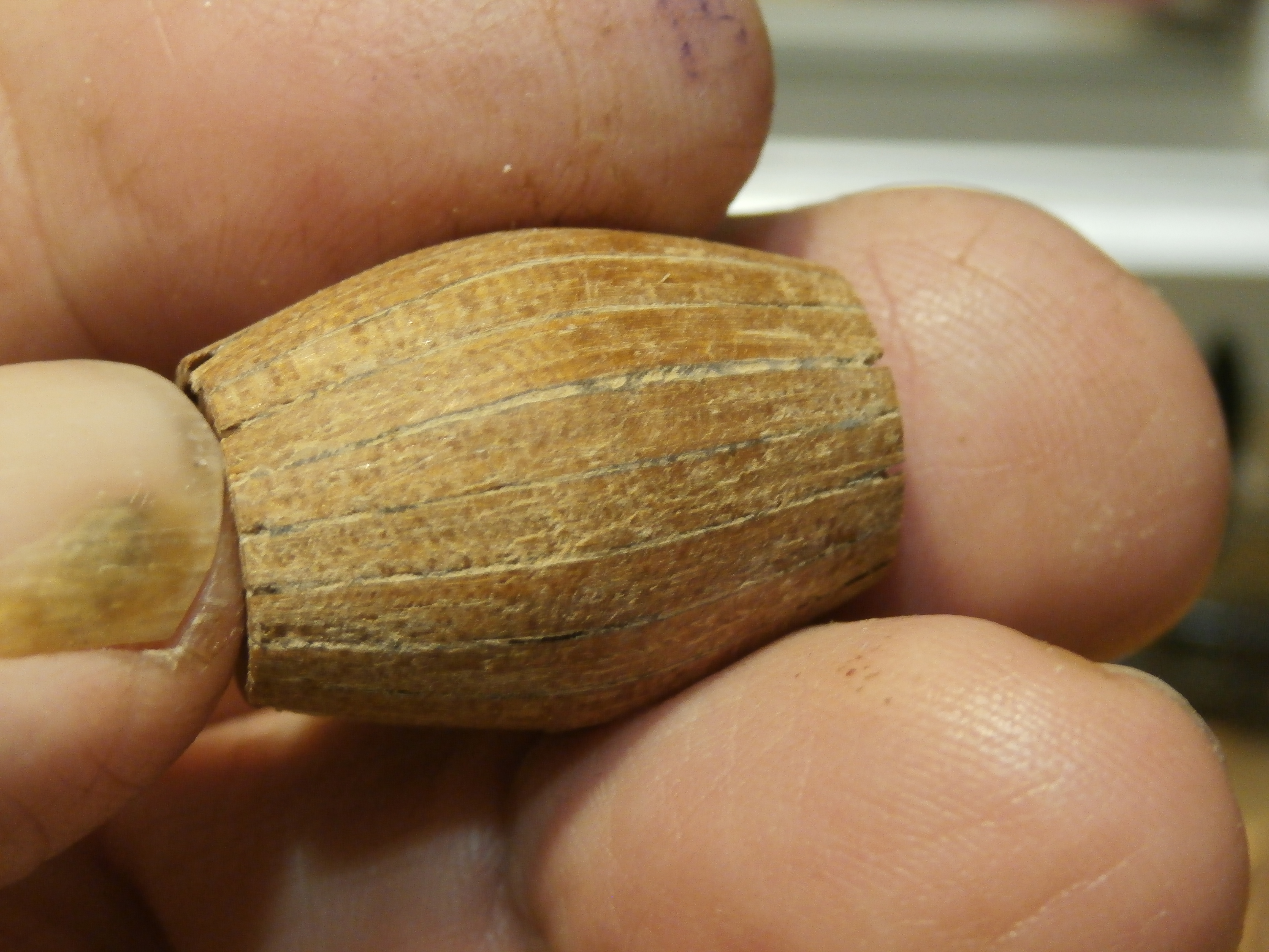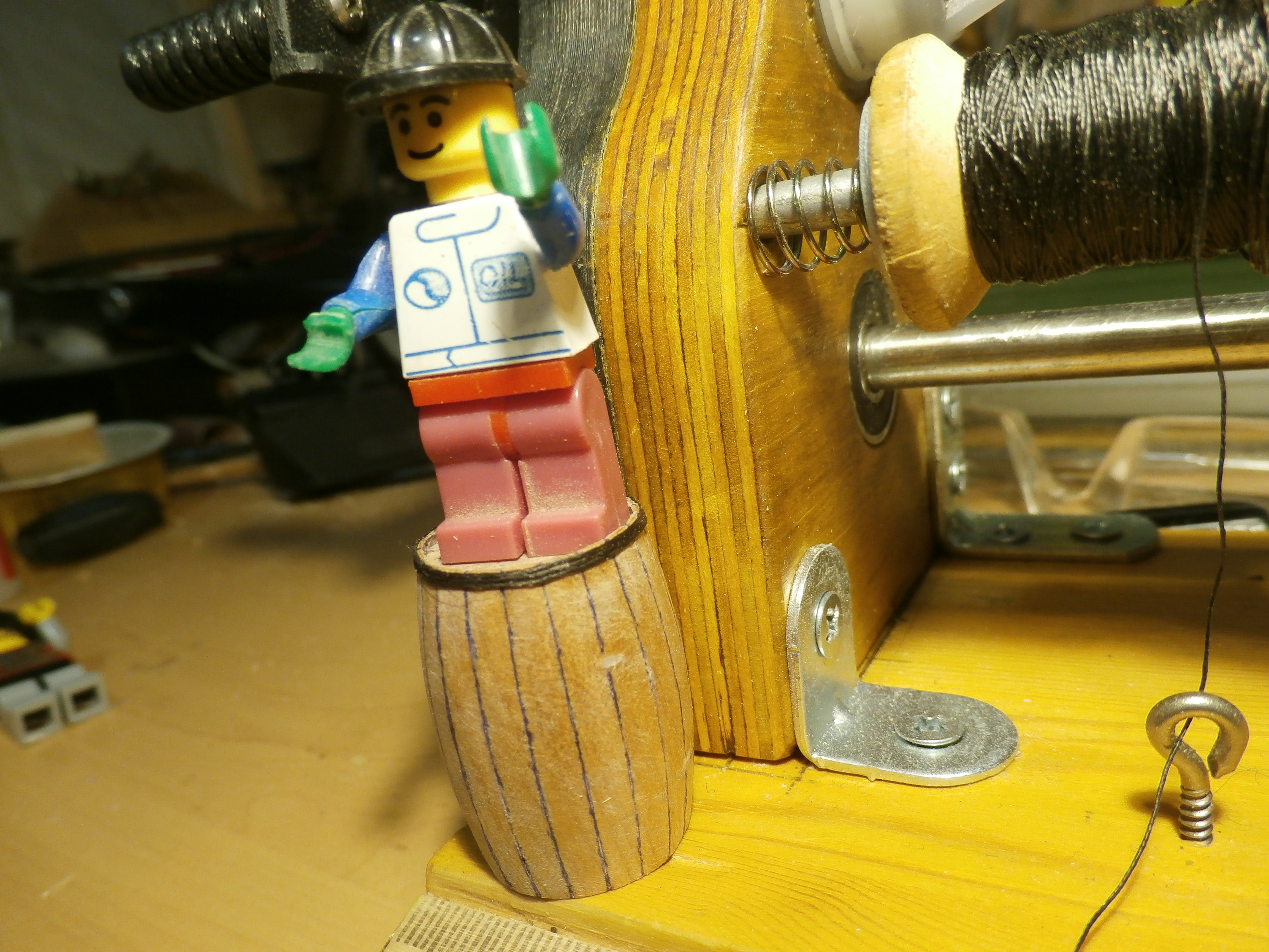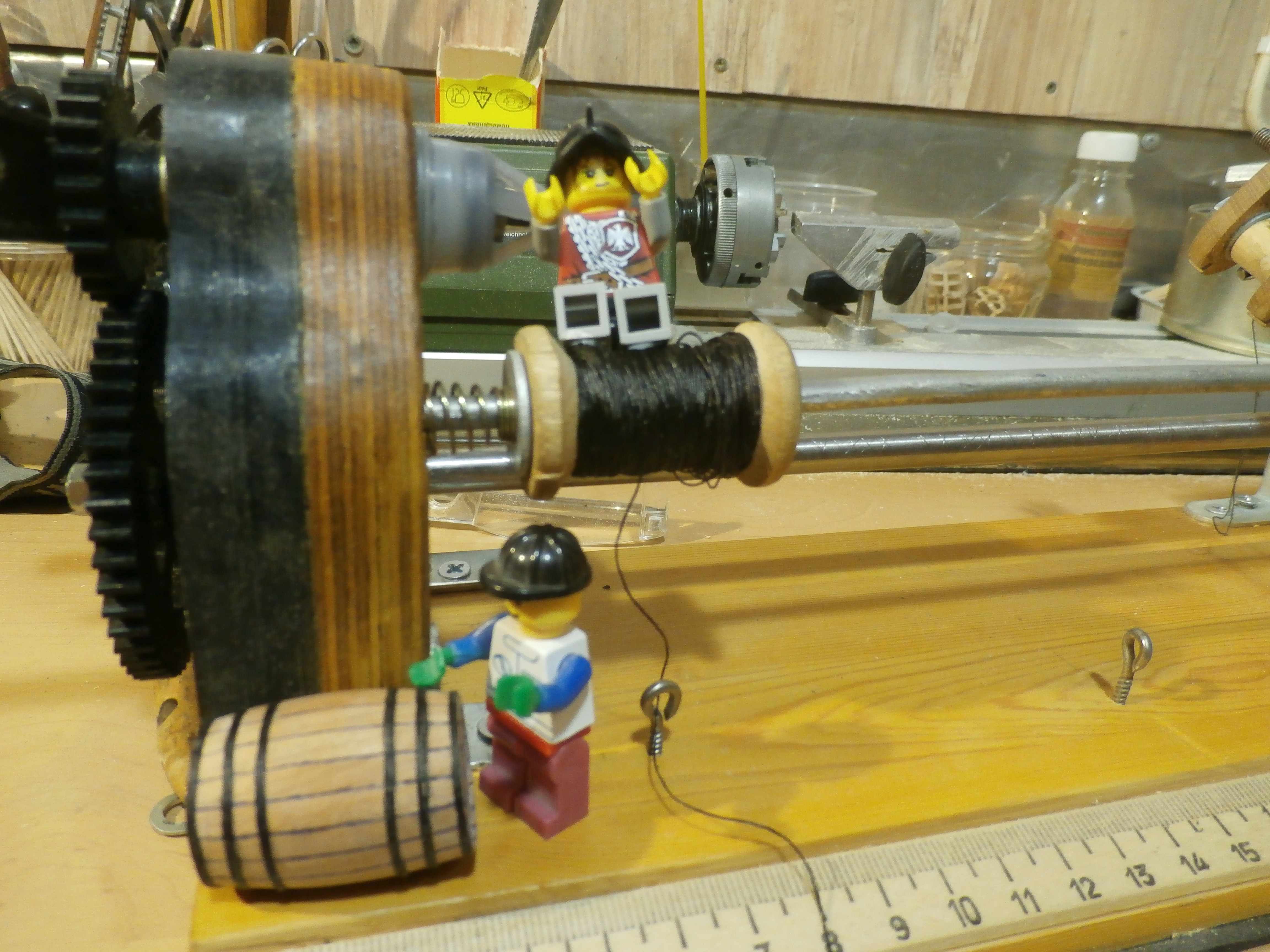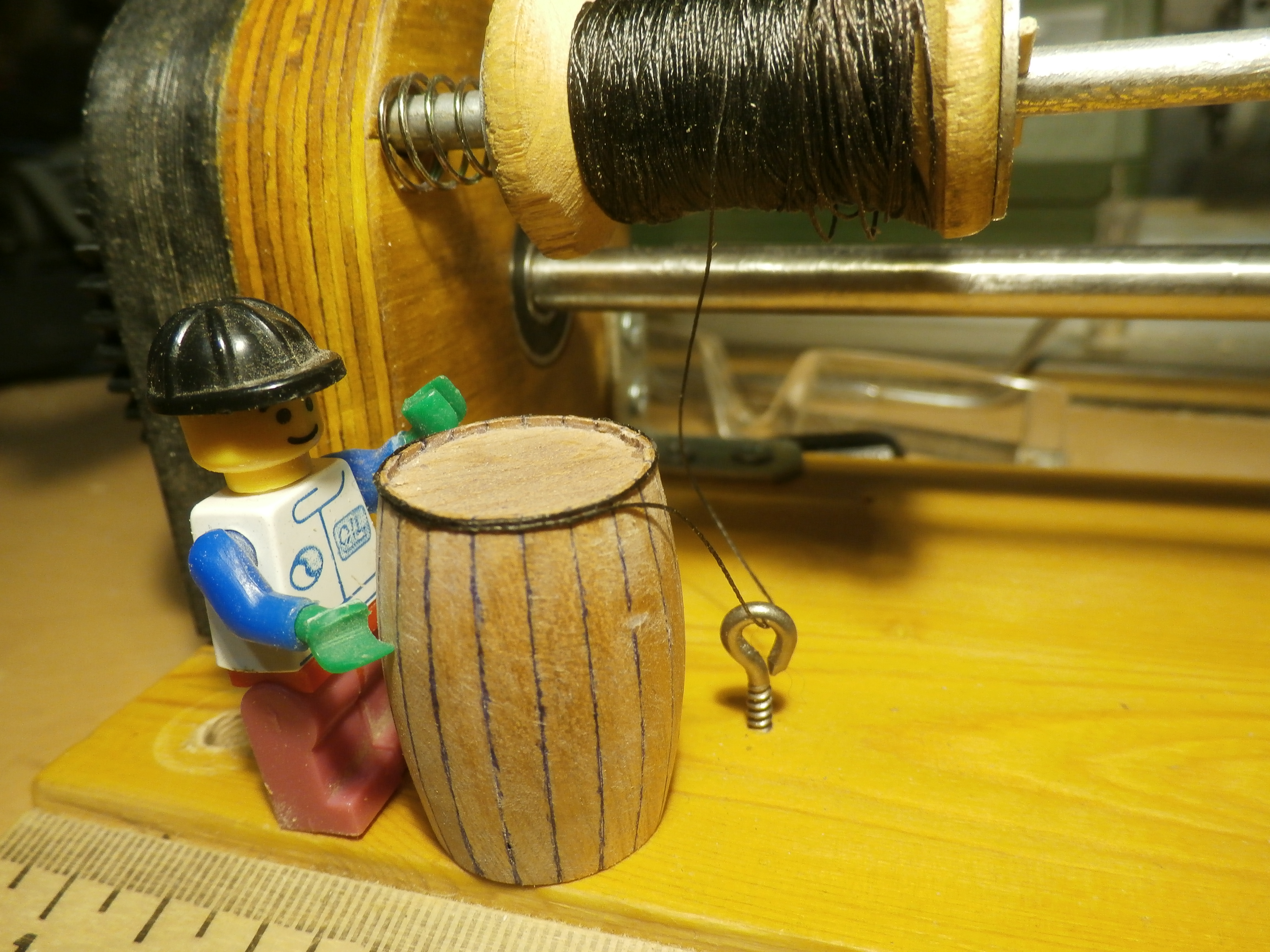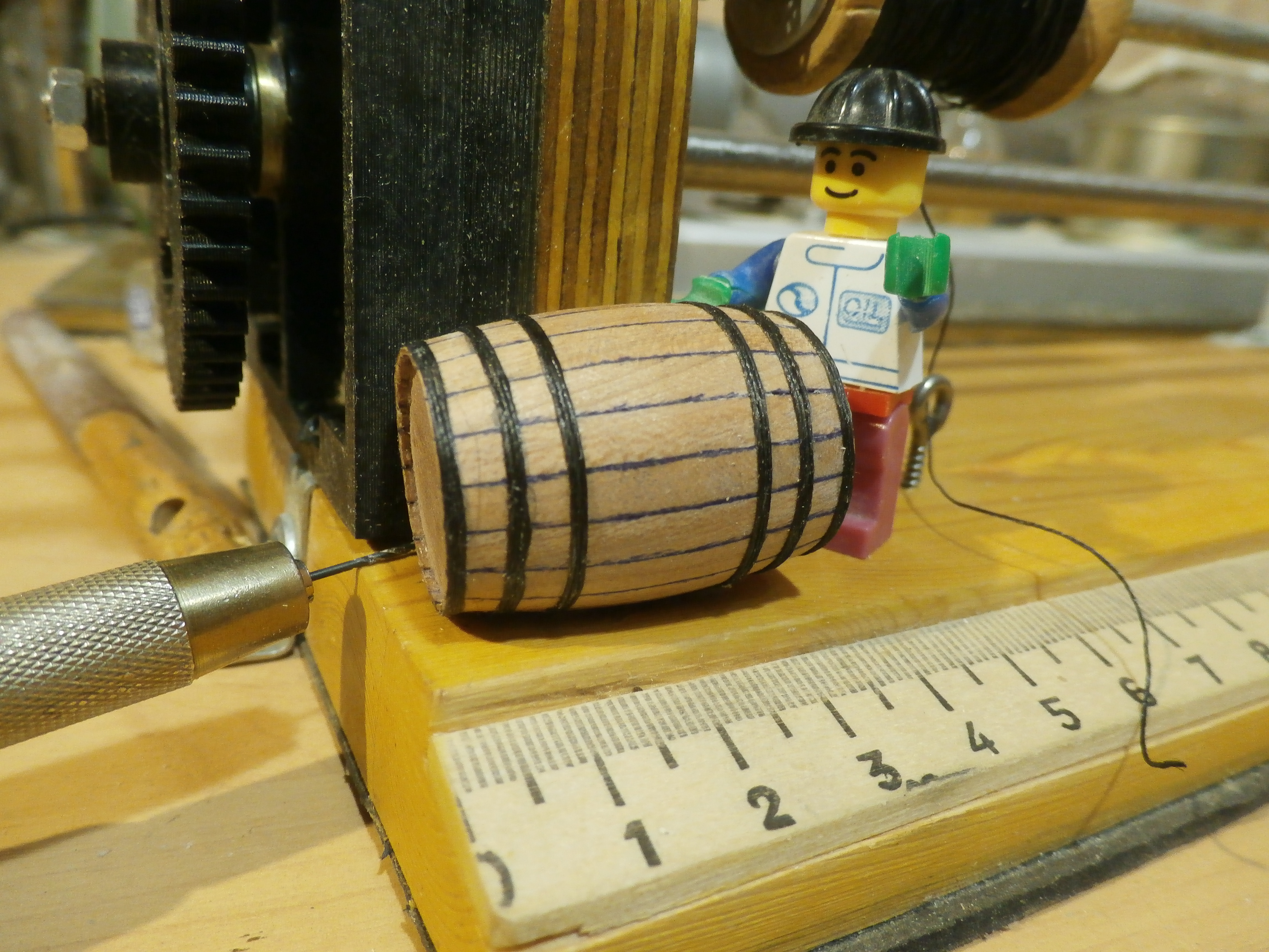 Первый обруч - "уторный" готов! Мой помощник - подмастерье шлет поздравление! Точно такой же обруч , три витка шелковой нити, закрепленной клеем ПВА на другом конце бочки. Что бы нить не скользила начало нити "утапливаем" в отверстии прсверленном сверлышком 0,5 мм в боку бочки , закрепляя нить тем же ПВА.