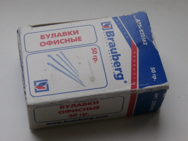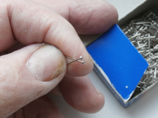 У Вас - благие намерения! Гвоздевание, на мой взгляд очень даже украшает модель. Но надо иметь очень много "медвежьего" терпения. На Западе, в модельных магазинах среди прочего продают гвоздики с различного диаметра шляпками. Это ускоряет процесс постройки и качество строительства нашего корабля! Я же нашел в своей Тьмуракани только вот такие офисные булавки. Радует такая мелочь - что их