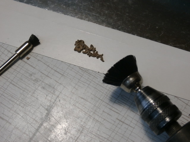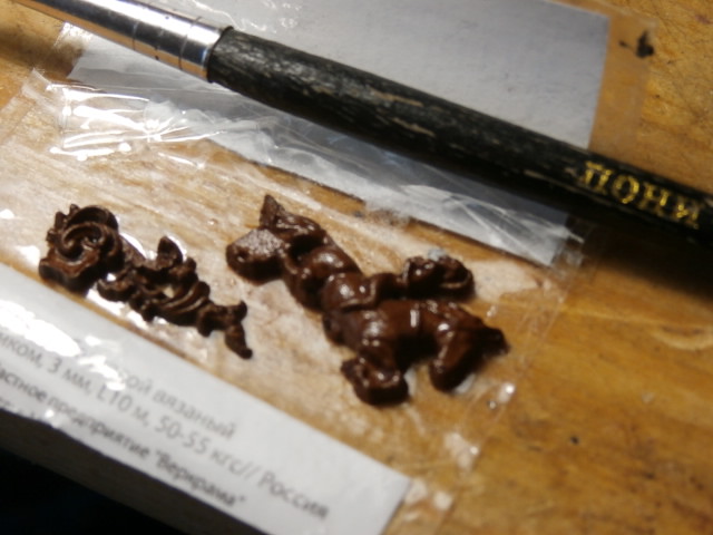 Стачиваем абразивом (шкуркой наклеенной на кусок стекла) подложку фигурки декора , острым скальпелем срезаем лишнее. Нейлоновой щеткой полируем саму фигурку, освобождая от микропыли и щепочек. Покрываем фигурку декора на первый раз декоративным китайским тунговым маслом. Для работы с тунговым маслом нужно учесть такую особенность, пишут производители, что ветошь пропитанная этим маслом может непредсказуемо вспыхнуть. Масло оно и есть масло - жирное, и хотя обычно первый слой полностью всасывается в глубину древесины, но клей деталь такую приклеивает не охотно и держит её не надежно. Я эти деталюшки буду крепить на медные штифты или на модельные гвоздики. Поэксперементировав на "кошке" я понял, что цвет , после обработки маслом меня вполне устраивает - темный , почти шоколадный цвет!