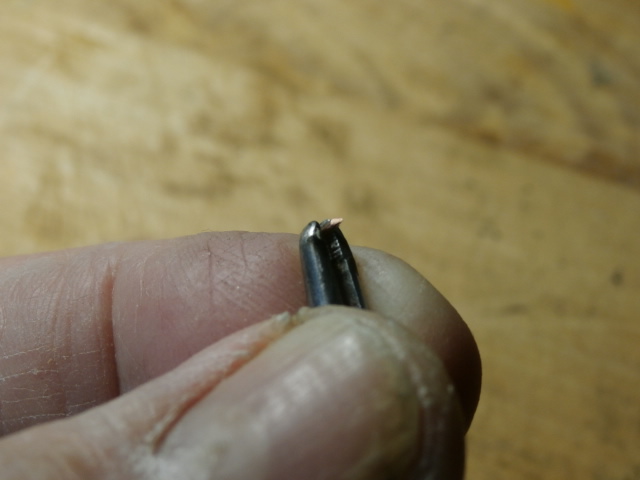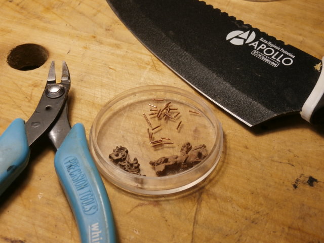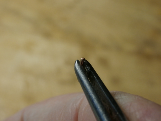 Технологию изготовления декоративных гвоздиков я описывал на своей веточке не один раз. Данные моих гвоздиков : Диаметр медной проволоки 0,6 мм. Аккуратно отрезая от проволоки гвоздик острыми бокорезами под углом получаю остриё гвоздя.Накатывая проволоку толстым и тупым ножом получаю сразу же шляпку. Гвозди - декоративные, я их делаю довольно короткими 5 - 7 мм. Что бы они позже не выпадывали из своих гнезд Сверлю гнезда в бархоуте в 0,5 мм. Гвозди забиваю миниатюрным молотком в "натяг" - этого вполне хватает, чтобы не пользоваться каким либо клеем.