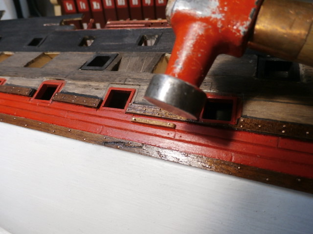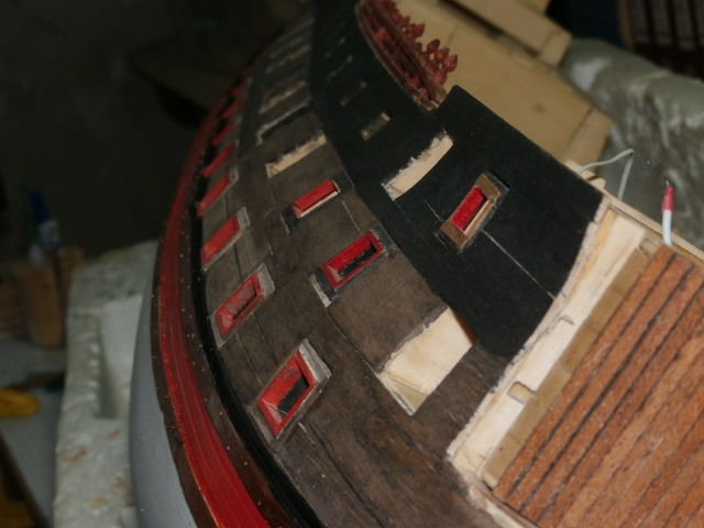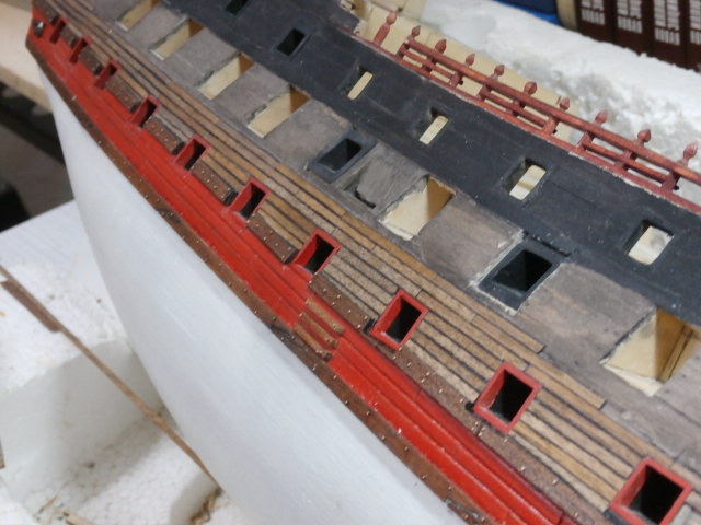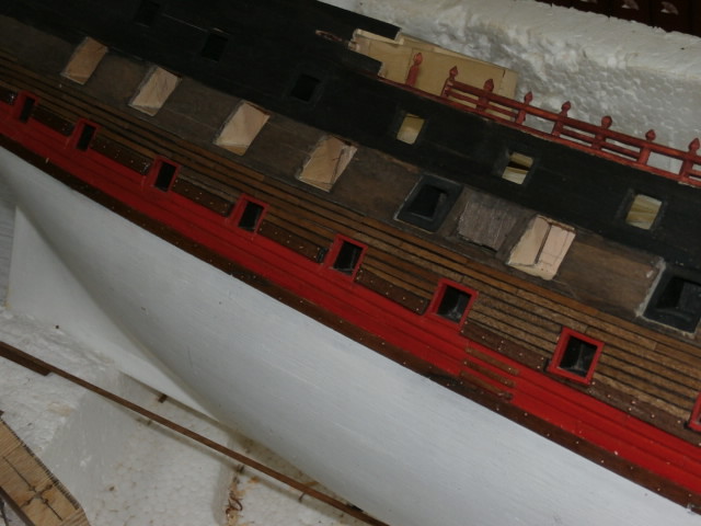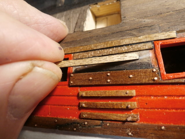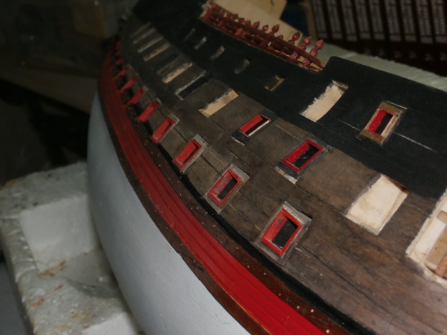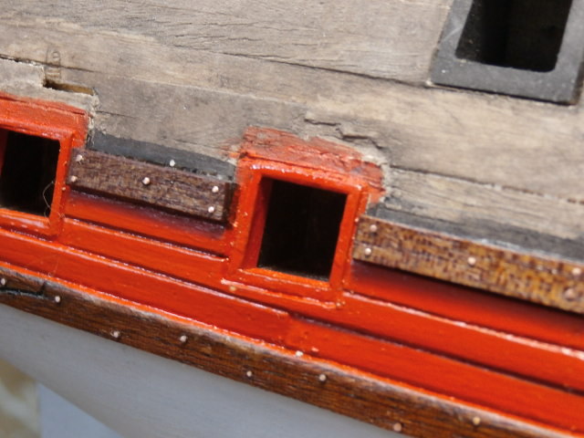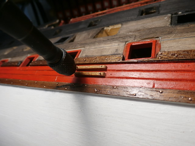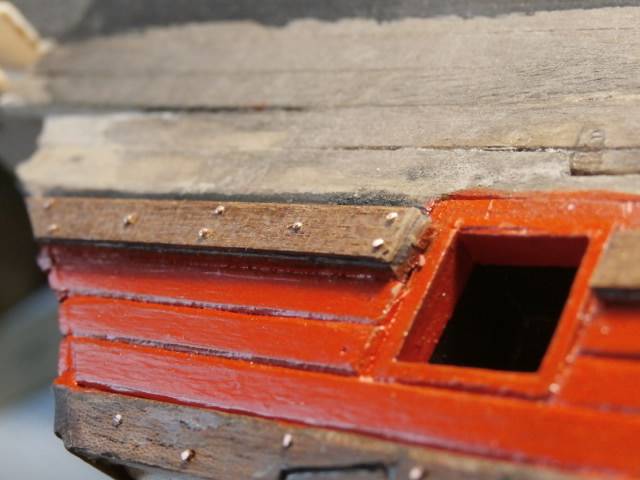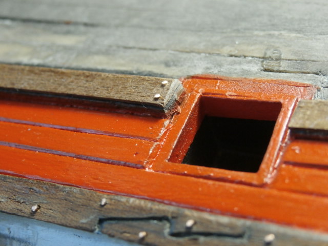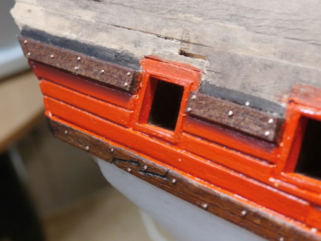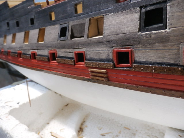 3. По правилам судостроения того времени доски обшивки не состыковывались между арт. портами. Доска продолжается от конца одного порта, до начала другого. Все состыковки должны быть или над портом или под портом.