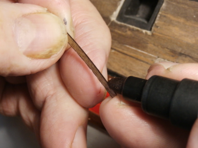 4. Я стараюсь показать , что борта моей обшивки состоят и обшиты досками. Поэтому я выписал планки ореха шириной в 2 мм. Кромки планок черню перманентным черным маркером. Длина доски не может быть длинной, до бесконечности. Обычная строительная доска по грубому, обычно около 5 - 6 метров. Я обычно оставляю возможно даже и меньшую такую длину, где то в удобном для меня месте стыковки. Между досками обшивки оставляю щель между досками обшивки на толщину лезвия модельного ножа. Если планки обшивки приклеивать одну рядом с другой, то получится эффект монолитного куска древесины. Так буду клеить на черной, верхней части корпуса модели.