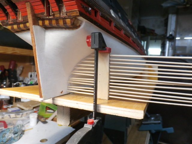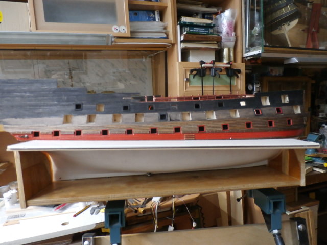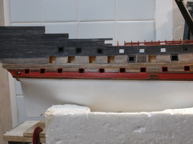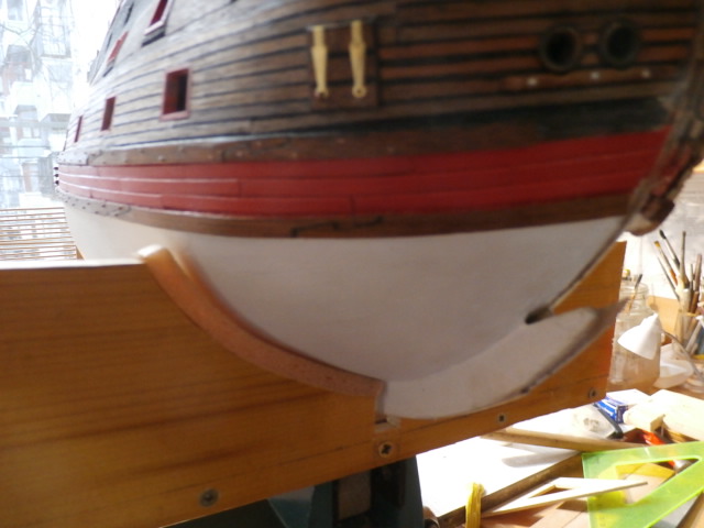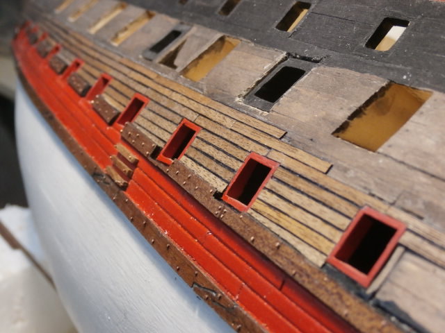 - Да! Нужно просто выполнять пошаговую сборку ДеА. Но к сожалению для меня это слишком просто и пресно. Я не могу не экспериментировать - такой уж у меня глупый характер. Этим я часто вляпываюсь в различные приключения и даже не всегда приятные... Когда я увидел на постере модели ДеА, на борту будущей модели оригинальную диагональную красную полосу, которая в корме взмывает вверх, а на носу глубоко ныряет в низ гон-дека, я тут же влюбился в этот элемент декора. Хотя здравый смысл мне нашептывал - Не связывайся! Это авантюра! Конечно нужно было просто топать по протоптанной тропинке пошаговой сборки модели, строя гон-дек без какой либо красной полосы, а саму полосу ниже и горизонтально. Но мы не любим ровную дорогу, нам подавай буераки! Я за время увлечения старинными парусниками ни разу в интернете не встречал модель у которой бархоуты были бы расположены не горизонтально, а под углом к поверхности воды. Хотя среди образцов крышек арт.портов в книгах знаменитых судомоделистов есть и такие крышки на которых наколочены брусья разрезанного бархоута и не только горизонтально, но и под углом - были. Система обвязки бархоутов силового корпуса корабля сложная с инженерной точки зрения проблема. Она должна противостоять любым нагрузкам от веса корабля, ветровым нагрузкам рангоута и парусов и от действия своей же артиллерии, особенно при стрельбе залпом и даже всем бортом корабля.