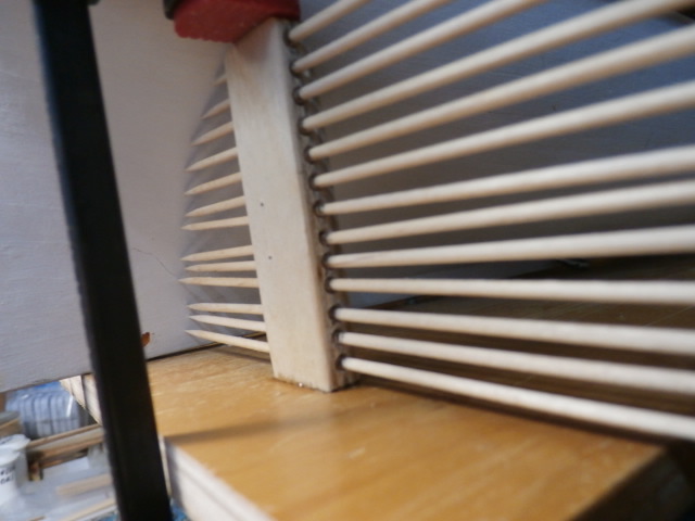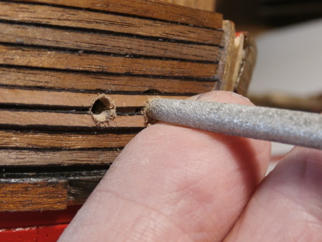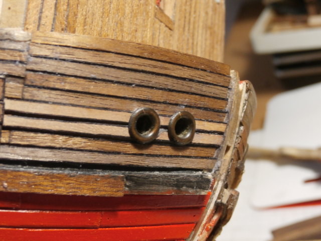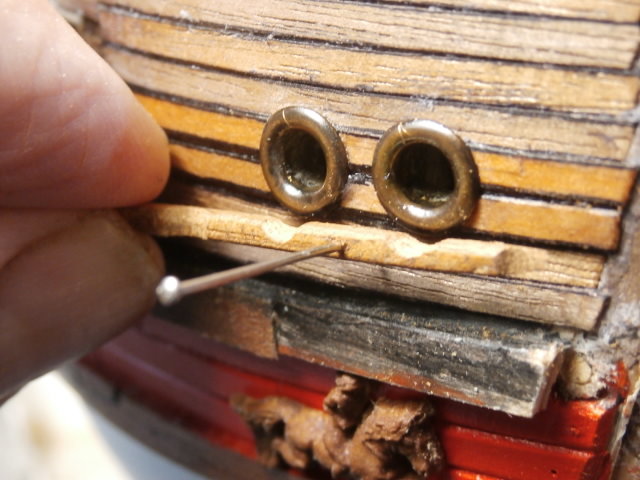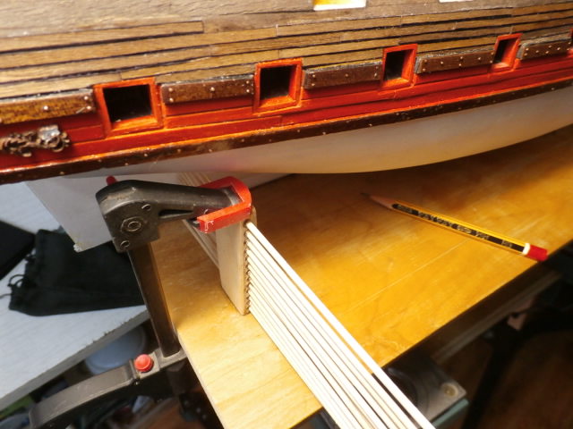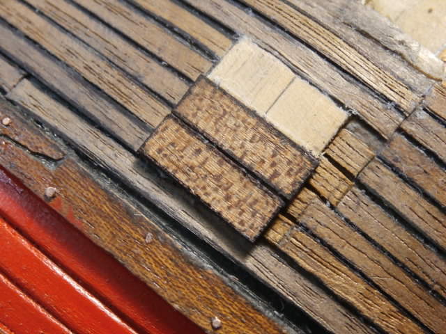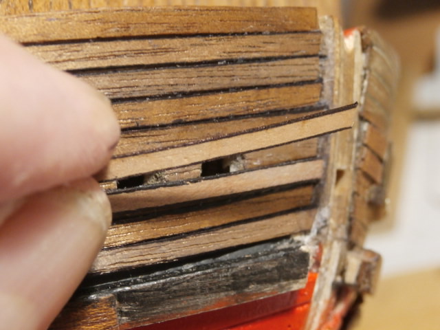 Укладываю две планки из груши. Они будут показывать, что место на корпусе , где установлены якорные клюзы усилено.