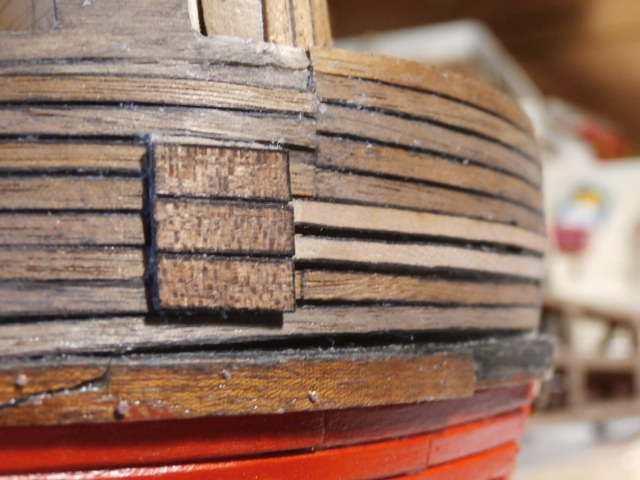 Возможно эти не обычные, диагональные бархоуты нашего корабля нашивались именно так, как и пишет Евгений Геннадьевич (АZET) Я знаю он большой любитель галеонов. Авторы постера на своей модели решили вопрос Дмитрия Владимировича просто, покрыли монолитно чистовую обшивку, планками , что не так и бросается в глаза. Планки обшивки повторяют изгиб нижних бархоутов. Мне же хотелось выделить каждую доску обшивки отдельно! В этом наверное и мой косяк. Переделывать я пока не думаю , посмотрим, когда будет покрыт весь борт чистовой обшивкой - тогда и определимся!