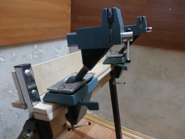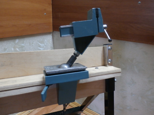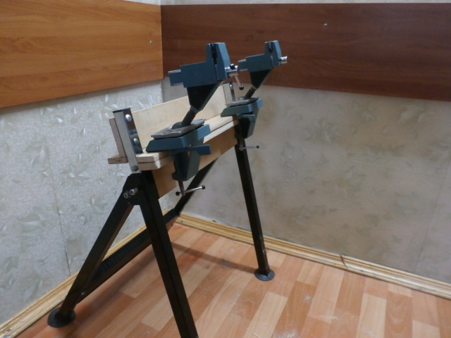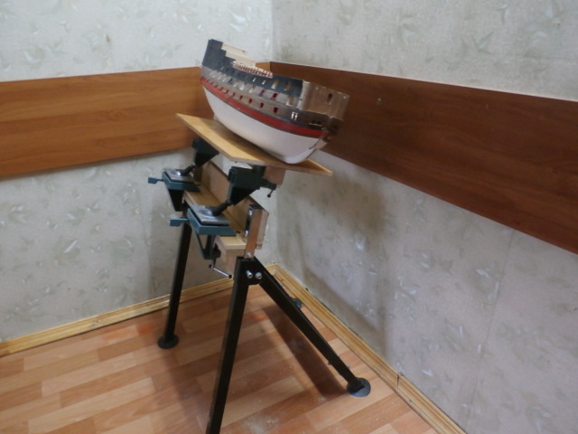 Последнее время вожусь с самодельным стапелем для своей модели. Перебрал множество вариантов. Начал со старой табуретки. Если перевернуть табуретку к кверху ножками , если обклеить внутри пенопластом, то вполне можно работать с моделью, носовой и кормовой оконечностями модели...Нет, мне не подходит этот вариант, хотя я в него угрохал два дня! Нет всё же старый вариант лучше! Не знаю, кто придумал шаровые тиски?! Но он гений, я уверен в этом! Не пожалел бы Нобелевской премии. Как все просто, шаровой шарнир позволяет тиски выставлять под любым рабочим углом."Дайте мне точку опоры и я переверну мир!" говаривал в своё время Архимед. Тиски я купил очень давно и они были прикреплены к рабочему столу. Верой и правдой мне служили. У них есть не большое "НО". Их нужно настраивать при работе на пару. В остальное же время они просто банально мешаются. Снять - занимают много места, которого мне так не хватает! Остаётся просто не замечать их, до нужного момента. Дома , в квартире я пользуюсь верстачком от китайских друзей, он износился и пора бы выкинуть на свалку и тут меня просветило "а что если соединить раму и шаровые тиски в один агрегат?!!! Действительно Эврика! Сразу забыл про старые табуретки!