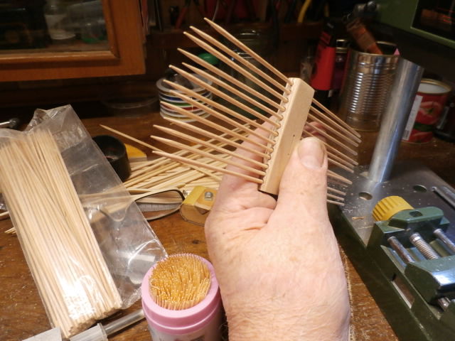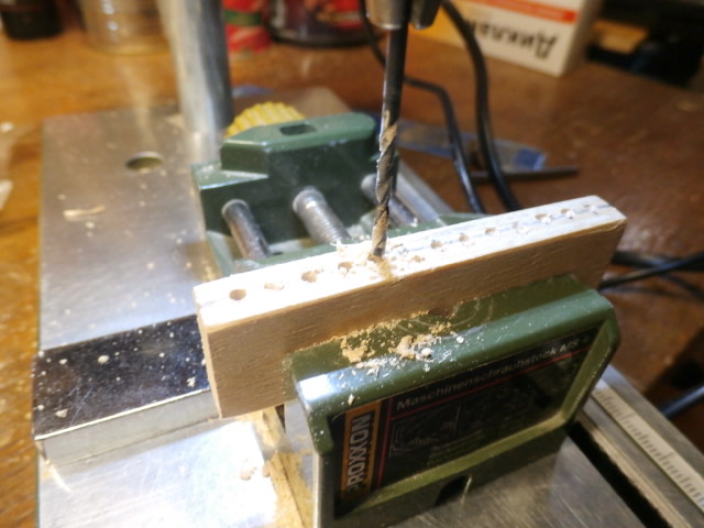 Корпус устройства делаю из многослойной фанеры. Ни чего другого под руками не оказалось.Рабочие органы из китайских 2 мм шампуров. Конечно многослойная фанера не совсем =айс=! Обычно слои фанеры различные по твердости. Но сверлильный станок от Проксона имеет довольно жесткую конструкцию пиноли и сверло не "убегает" в сторону., что возможно бы получилось если сверлить ручной эл.дрелью!