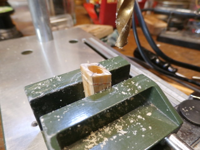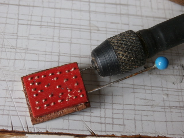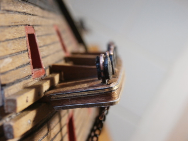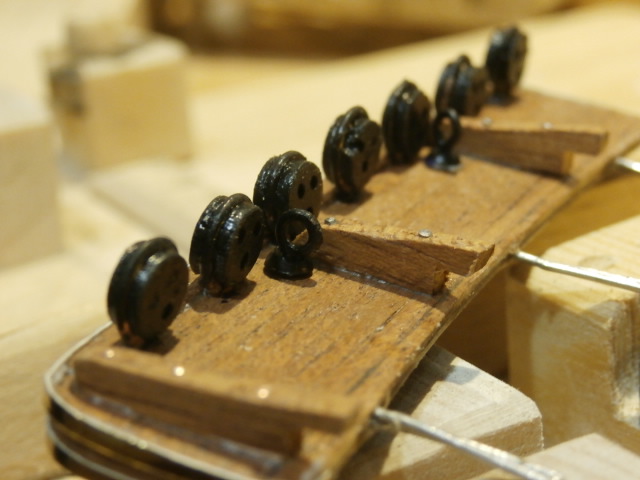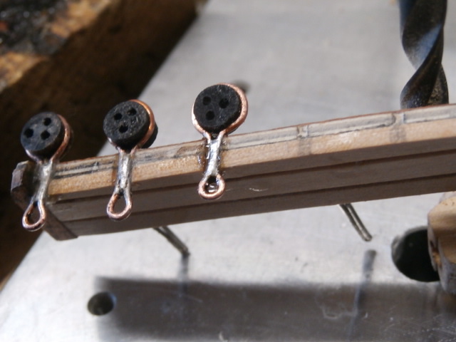 Вант-путенсы вместе с юферсами на месте! Распределял юферсы на площадке при помощи обрезка шпагата и временной фок-мачты. (См. выше) Гнездо под вант-путенс выпиливал в теле площадки при помощи боковой грани плоского надфиля. Вклеивал при помощи секундного клея. Юферсы на фото только заморённые морилкой цвета "Эбен". Потом, уже на месте их отполирую нажд.бумагой разной зерн. и покрою акриловой краской черного цвета вместе с металлом вант-путенса.