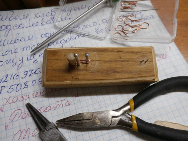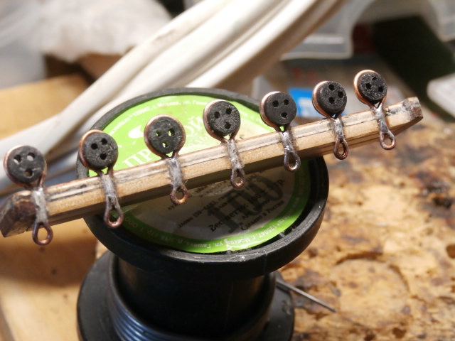 Вант-путенсы для русленя готовы.Следующая операция пайка вант-путенца оловом. Надо постараться, что бы все было сделано добротно. Инструмент - эл.паяльник , канифоль. припой. Вы скажите - дедовский способ! Я в полне согласен. Но сейчас пандемия, я как то упустил до этого побегать по магазинам и позаботиться о ново манерных индигриентах. Значит будем делать годами проверенным способом. По крайней мере надежно! 1 мм центральная стальная и обмедненная жила из телекабеля паяется очень хорошо, даже на простой канифоли!