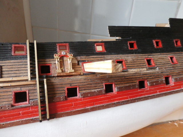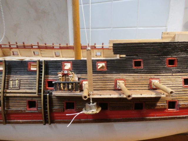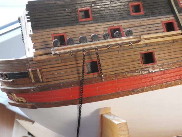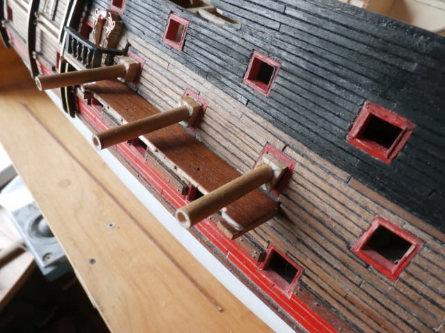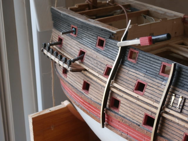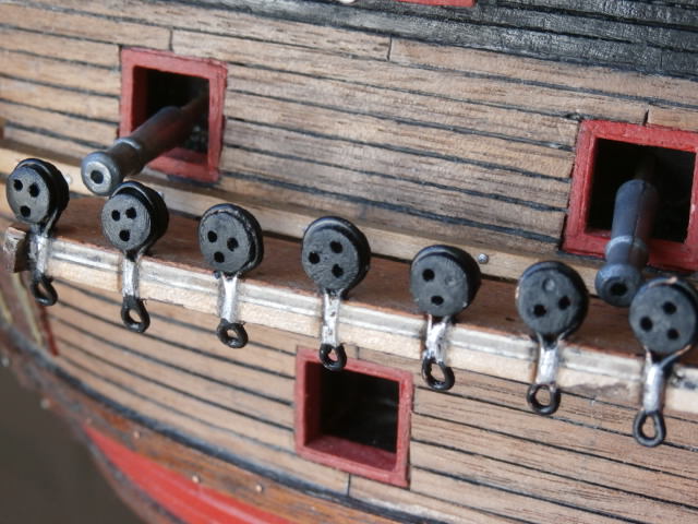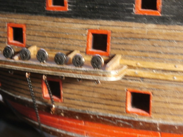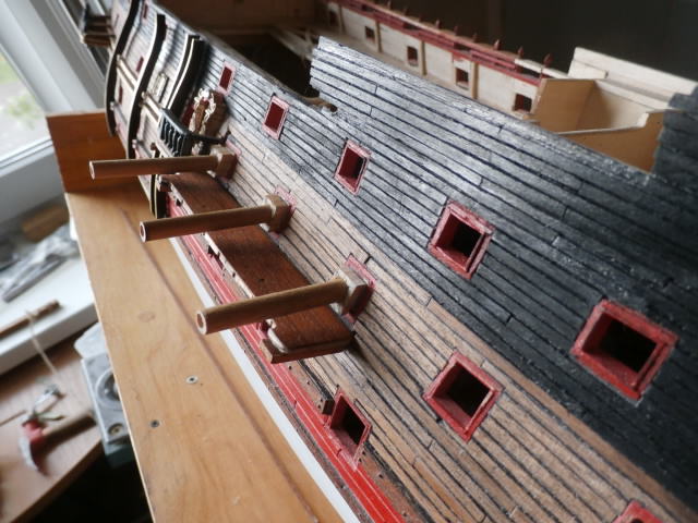 Изготавливаю вкладыши в пушечные порта модели из бросового материала - сосны. Вставляю в эти вкладыши длинные круглые буковые палочки, которые у меня временно будут играть роль фальш - пушек. Остается последнее - распределить равномерно пространство русленя так чтобы ванты и юферсы мачты не мешали в работе корабельных орудий.