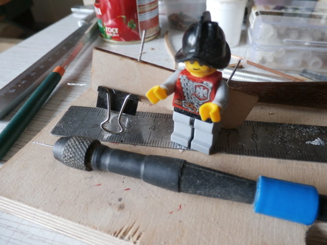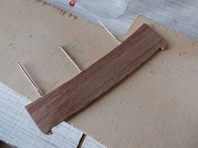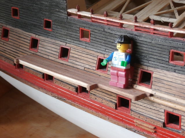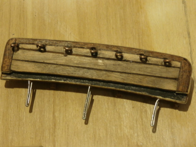 Работаю с носовым русленем по левому борту. Сама площадка пока не закреплена на борту, легко снимается и вставляется в свое штатное место при помощи метал. нагелей. Работать с деталировкой русленя в несколько раз проще, сняв её и положив на поверхность стола, чем , если она уже закреплена на своём месте...