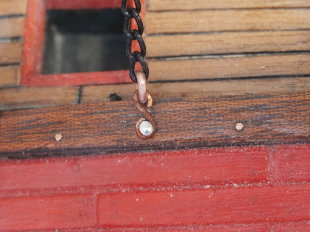 Крепление вант-путенцев должно быть максимально надежным. В верху цепь я вешаю на маленькое кольцо, стык которого я запаиваю эл.паяльником. Цепь у меня попалась довольно надежной, звенья которой не только прокрашены черной краской но и обработаны , я думаю эбокситным клеем. Возможно и все 2 в одном флаконе. = Возможно цепь окрашена жидким клеем с добавлением черной краски.Но в любом случае надеяться на прочность этой цепочки - не приходится. Это чисто декоративная деталь модели, не нужно рисковать, сильно натягивая цепочку...