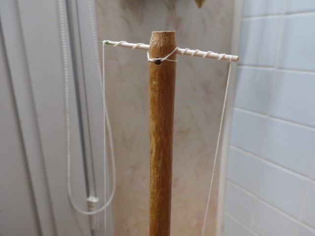 Что бы разметить на русленевой площадке вант-путенсы как минимум нам нужна фальш.мачта. Её функцию выполняет круглая буковая палочка. Функцию ванты у меня выполняет двойная толстая капроновая нить. Для того что бы нить висела устойчиво, не крутилась, на макушке "мачты" я вставил зубочистку, разведя нити друг от друга. Внизу повесил груз в виде пуговицы и гайки. Для того чтобы компенсировать ширину юферсов и их обвазку на вантах и вант-путенцах я добавил фанерные полоски шириной в шесть миллиметров. ( у меня на грот-руслене будут 6 мм юферсы)