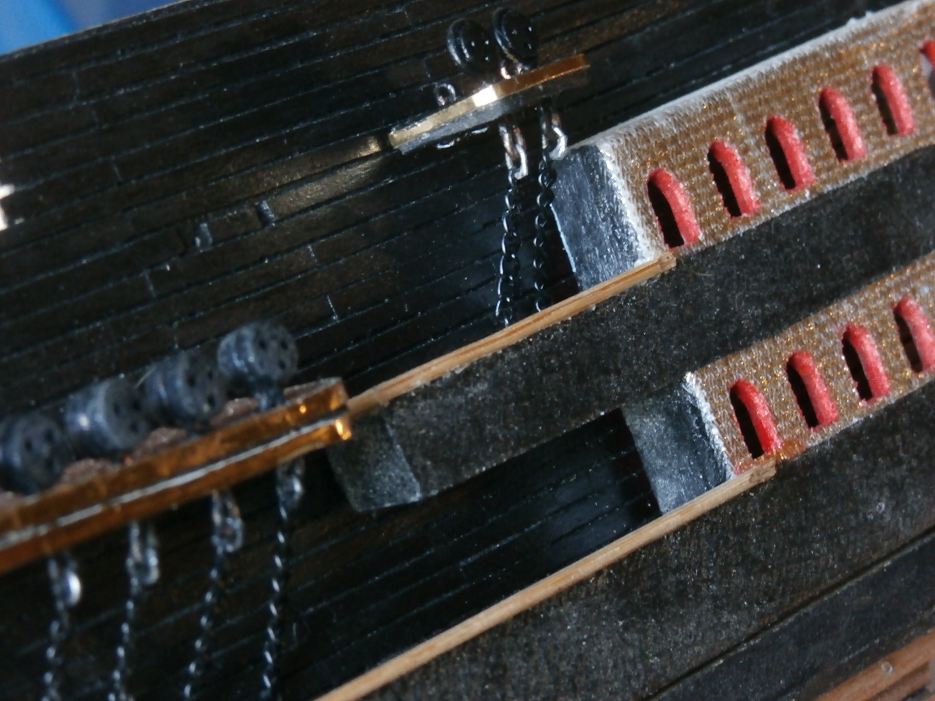 Добрый вечер. Если вы планируете оснащать стеньги ст. такелажем по полной программе,т.е добавлять бакштаги, то вам придётся делать фактически другой вантовый руслень, т.е. делать его длиннее и шире и возможно сдвигать его в корму, как сделано на приведённом фото,я имею в виду например руслень фок мачты, иначе бакштаги при проводке будут задевать за планшири марсов. Бакштаги надо устанавливать на кормовой край русленя.Поскольку бакштаги расположены за вантами ближе к борту, чтобы они не задевали открытых крышек ПП,надо либо делать руслень достаточно широким (что не очень красиво), либо выбирать место оптимальной проводки.На мой взгляд это место между третьим и четвёртым ПП мидлдека. Но если вы туда продлите руслень. то на него и фордуны можно закрепить.Что касается бом-брам стеньги, там отдельная песня Я не стал заморачиваться с бакштагами, отказался от их установки и установил и установил полку (малый руслень) только для фордунов в указанном месте. Мне показалось это проще и технологичней. Почему полка а не бархоут? Если вы ставите на бархоут, это совсем близко к борту, шкентель блока талей задевает за планшир борта.Обратите внимание, на постере все шкентели блока талей фордунов закреплены не палубе и этой проблемы нет. Если вы хотите обтягивать фордуны с помощью юферсов без полки просто не обойтись. Такие же проблемы возникают и по стеньгам грот мачты. Что касается бизани там мест для крепления рымов для крепления шкентелей нет, да и борт плоский, поэтому тросы фордунов или тальрепы юферсов будут тереться о борт и планширь, нужна полка для выноса снастей от борта.
