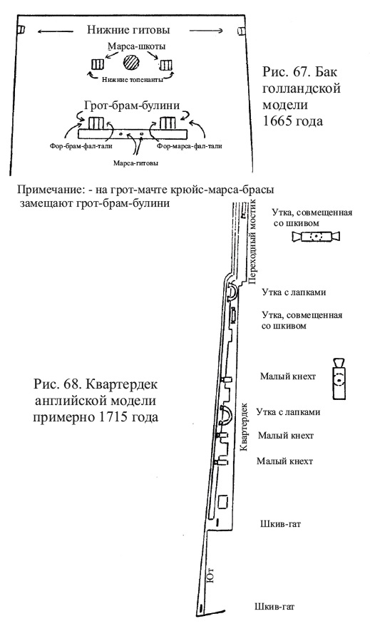 А вот шкентели блоков талей, в английской проводке, как раз были выше, чем в континентальной, поэтому проблем с планширем не будет. А вот, шкентели бакштагов, находились на уровне марса, собственно, там шёл одношкивный простой блок вплеснённый(ух!, слово,то какое), как раз крепился к планширю или к верхней части шпангоута.
