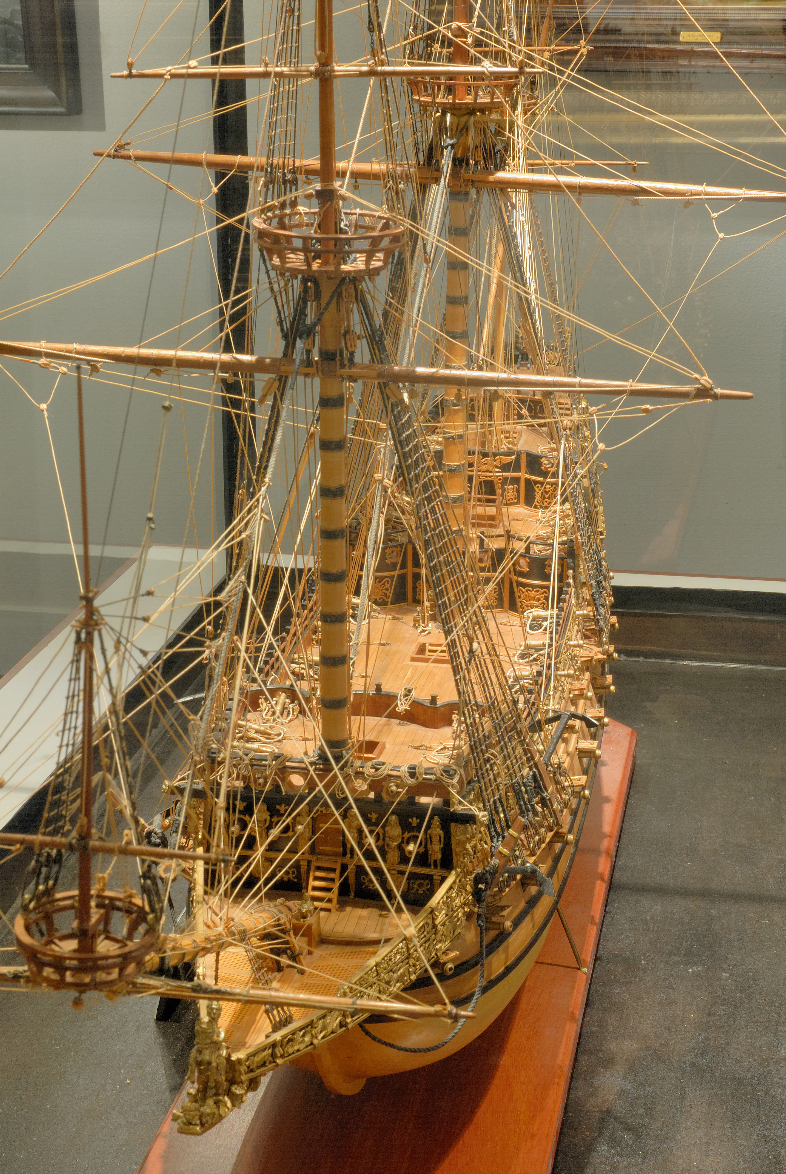 Вот ещё, Сергей Николаевич, обратите внимание, что автор модели крепит бакштаги, как на более поздних кораблях, где они были съёмными, на руслень, через гак, за вантами. И количество вант, так же меньше, как на более поздних.