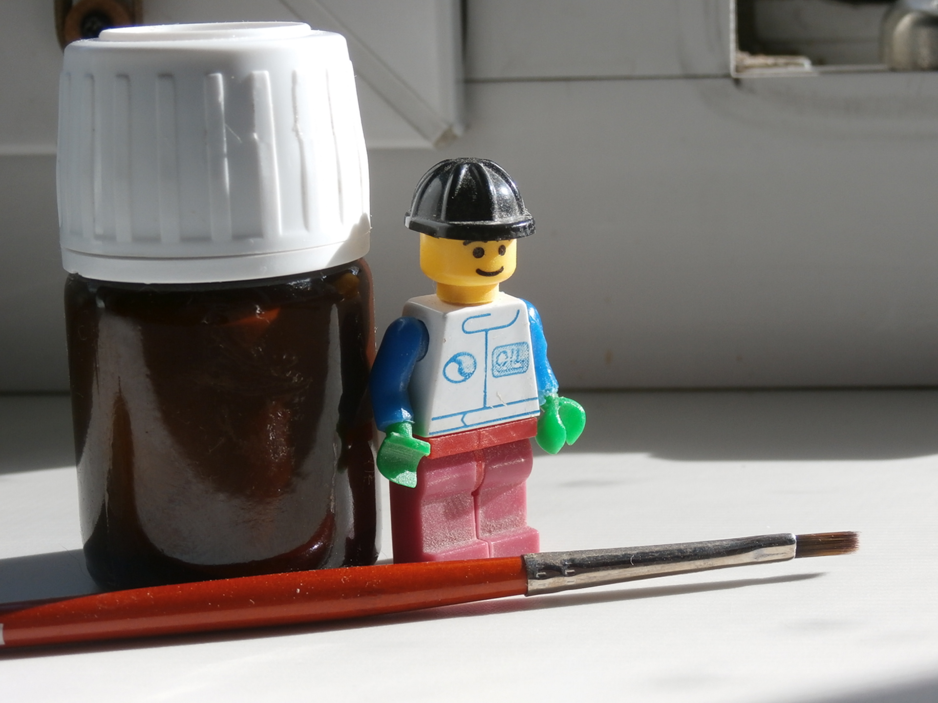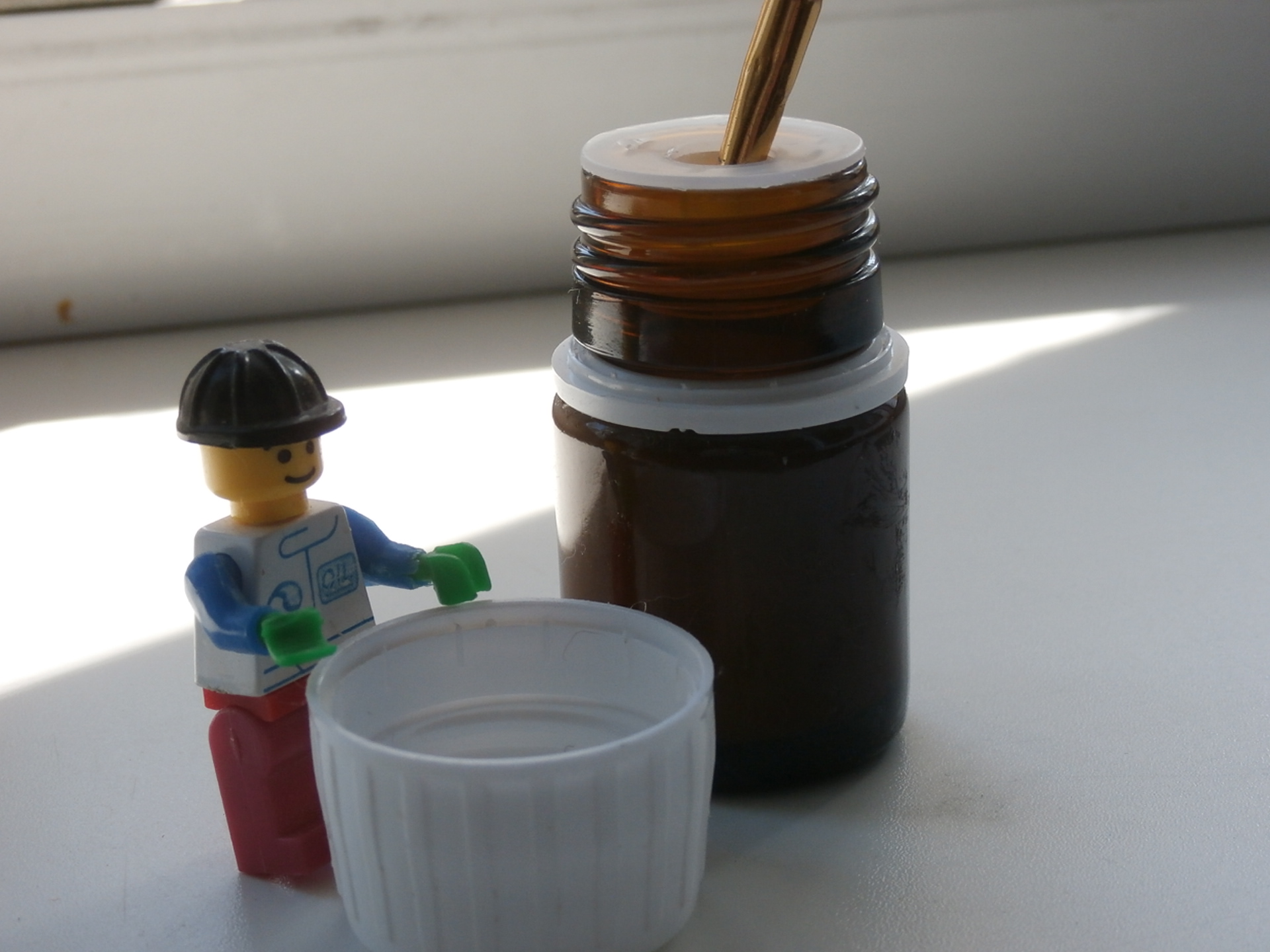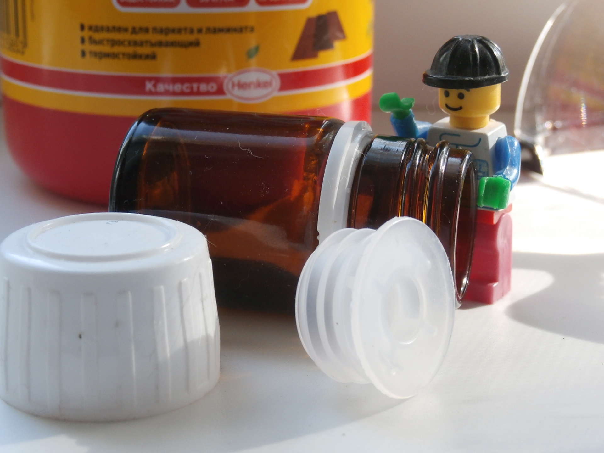 Внутреннюю крышку флакона я сделал с отверстием, что бы туда могла пройти рабочая кисточка. (Из всех способов мне больше всего нравится клеить детали кисточкой. Кисточка не даст выветриваться клею, а в конце занятия, вынимаю и промываю кисточку водой, а флакон закрываю крышкой.)