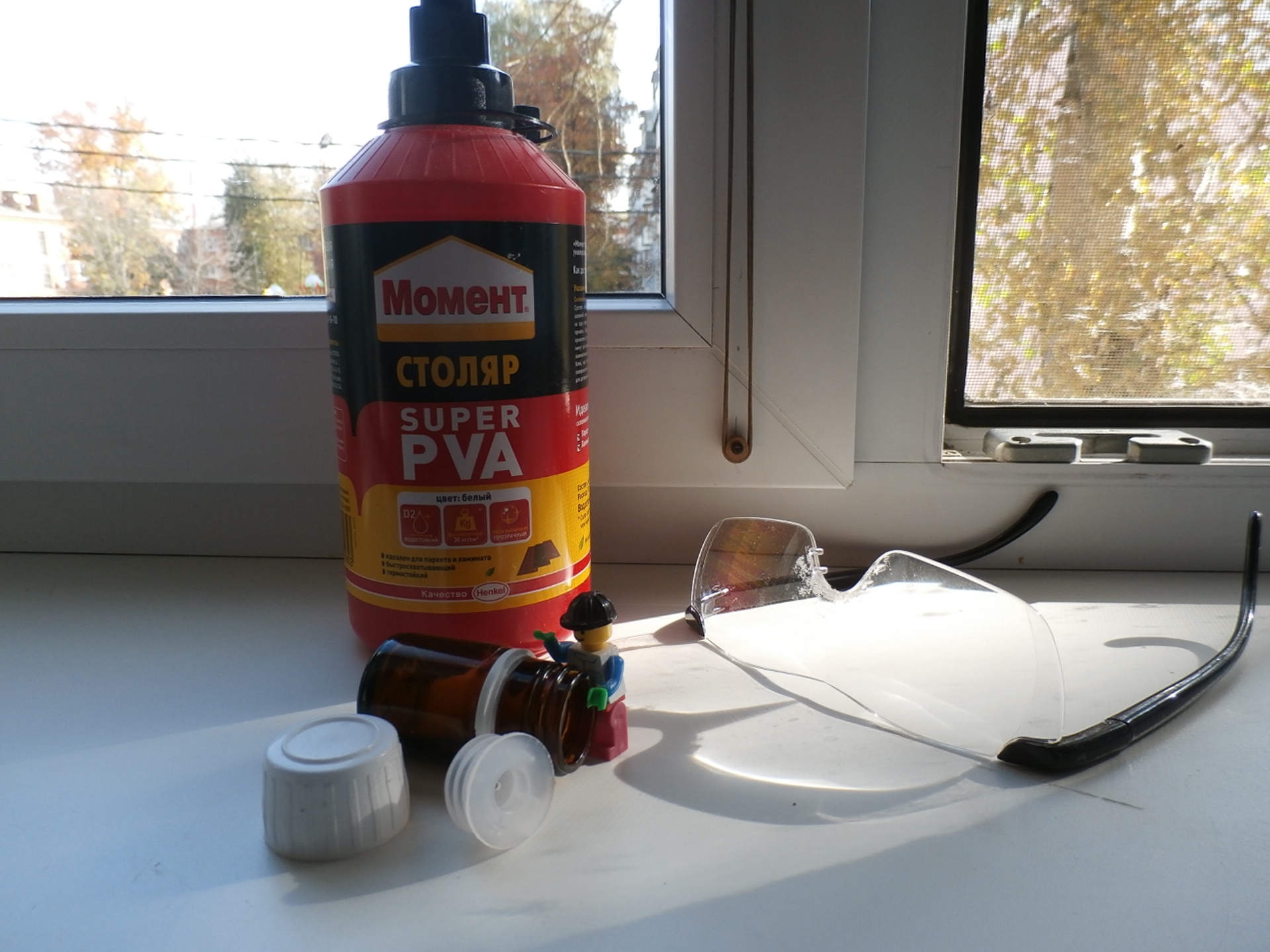 В течении лета я нашел , как мне кажется удобный стеклянный увесистый флакончик. Он будет устойчивым и расходным,в нем буду хранить рабочий раствор клея ПВА. Как всегда Момент. Столяр super PVA. В красном флаконе с водостойкостью D2.