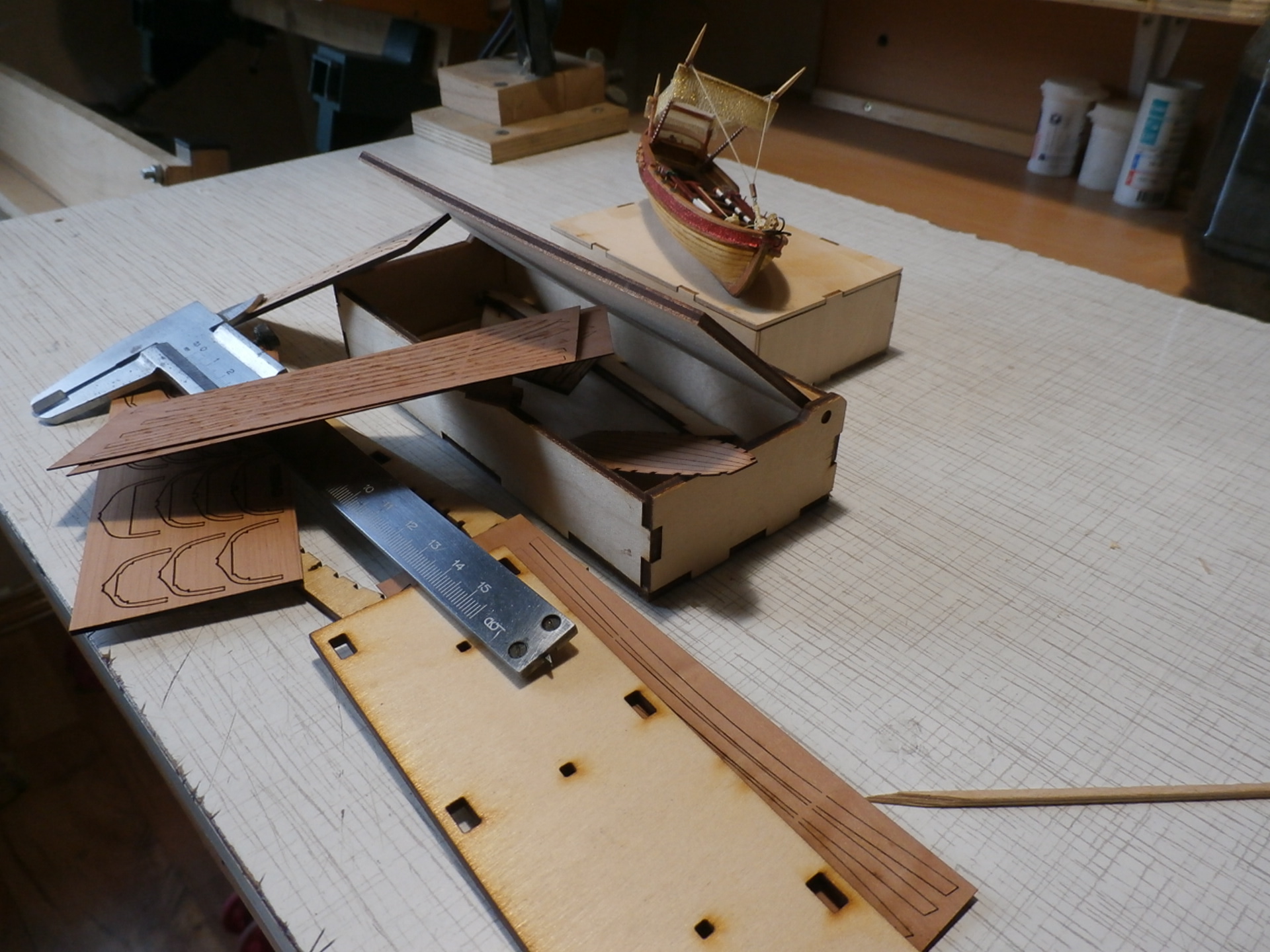 Сегодня у нас холодно ( только 4 градуса тепла) пасмурно и с самого утра за окном моросит дождь. Но на душе праздник. Можно с чистой совестью заняться моделью. Повелитель давно уже ждет своей очереди, новым работам по строительству на моей верфи, что расположена у меня на письменном столе... Заждались и мои помощники. Я долгое время сомневался, прикидывал с чего начать этот предстоящий этап строительства. Выбор остановил я на изготовление второй по величине шлюпки нашего корабля -ПИНАСА. Которая являлась не только спасательной но и рабочей шлюпкой корабля. Критерий выбора её размеры. На верхней палубе , на шканцах модели линкора не так и уж мого места. Шлюпку я выбрал длиной 120мм и шириной 34 мм. По моим расчетам она должна зайти между грот-мачтой и задней переборкой носовой надстройки- фор-дека. Выбор мой выпал на КИТ "Российская восьмивесельная шлюпка ХYIII века". Шлюпка будет строиться из качественного, хорошо просушенного материала - груши. Детали аккуратно вырезанные лазером. Покупал я её давненько и к моему сожалению инструкция постройки мной со временем потерена. Надеюсь я на интернет, ваши благожелательные советы и отзывы.
