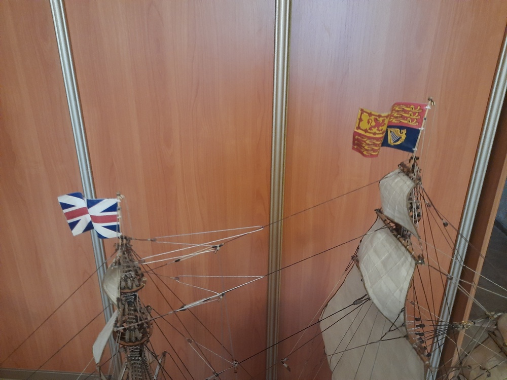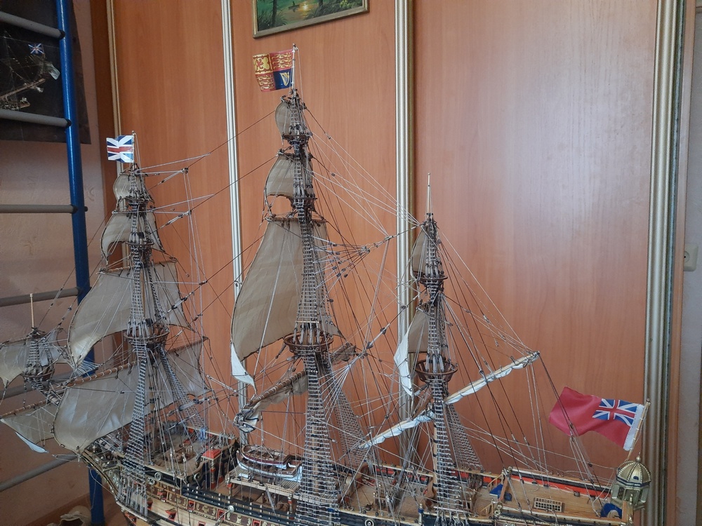 .Хочу показать вам флаги изготовленные по технологии о кот. я писал. При этом флаги на фок и грот мачтах из набора от ДеА, т.е. бумажные. Кормовой флаг из шёлка, он из моих запасов.По технологии изготовления бумажные флаги сложнее и требуют большего труда и старания. Флагов на гюйс и на бизань мачту у меня пока нет, вернее есть заготовки для изготовления. Будем работать дальше!