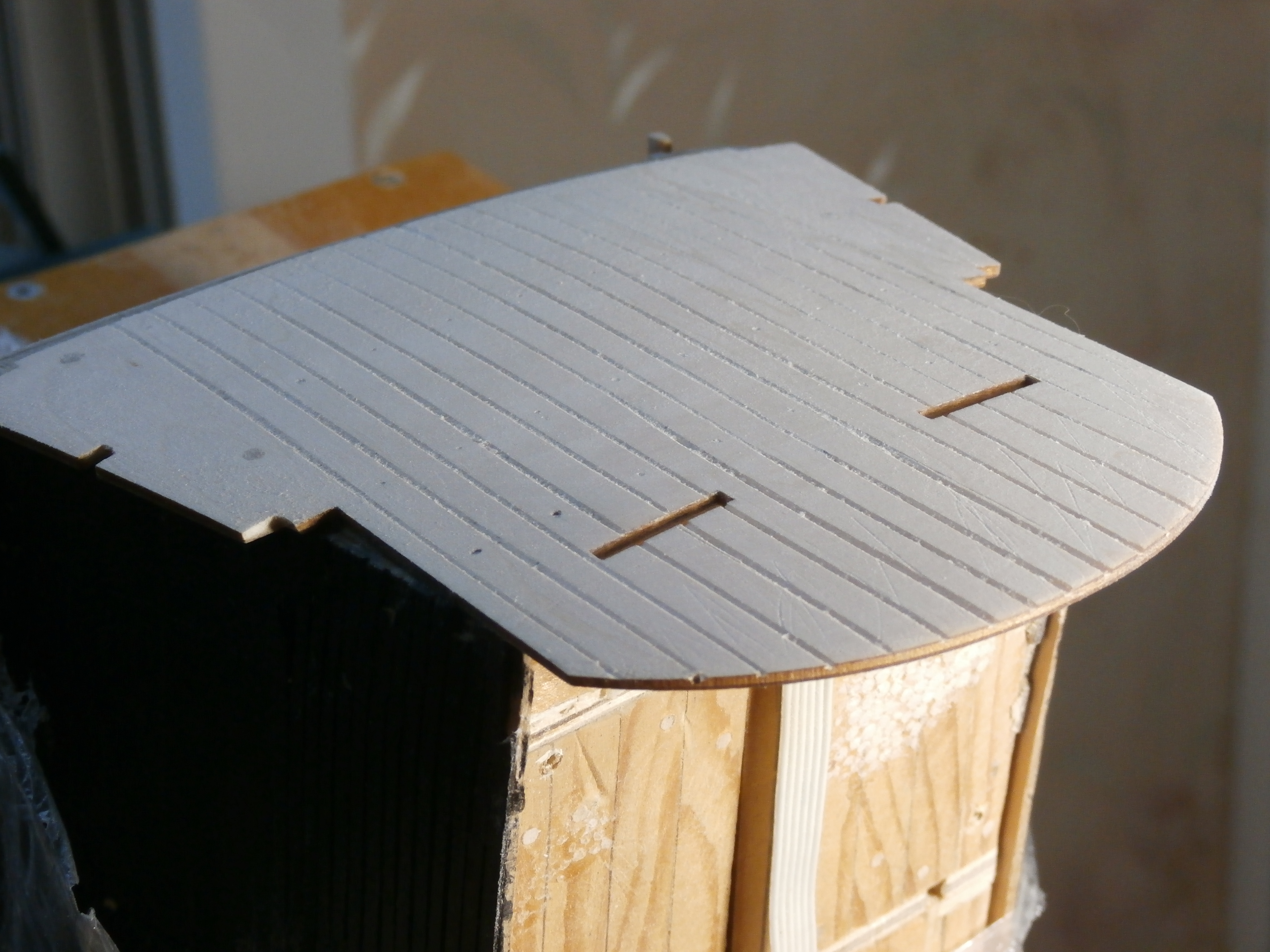 Подвожу мои скромные результаты по обустройству кормы модели. Заполнив пустоту кормовых отсеков брусками из МДФ и ели с клеем ПВА, обточив всё по месту, я наклеил штатную фанерную кормовую переборку. (гакаборт). Закрепил на клею и часть штатной палубы поп-дека к корпусу модели и к гакаборту Повелителя. Всё это дало дополнительную жесткость конструкции кормовой части модели,а гаккаборту возможность при высыхании клея сохранить полукруглую, изогнутую форму заданную проектом ДеА. Гакаборт на место лег на своё место без проблем. Этому способствовали мелкие и не глубокие пропилы на переборке и нанесение тонкого слоя кипятка широкой кисточкой, во время приклеивания гакаборта.