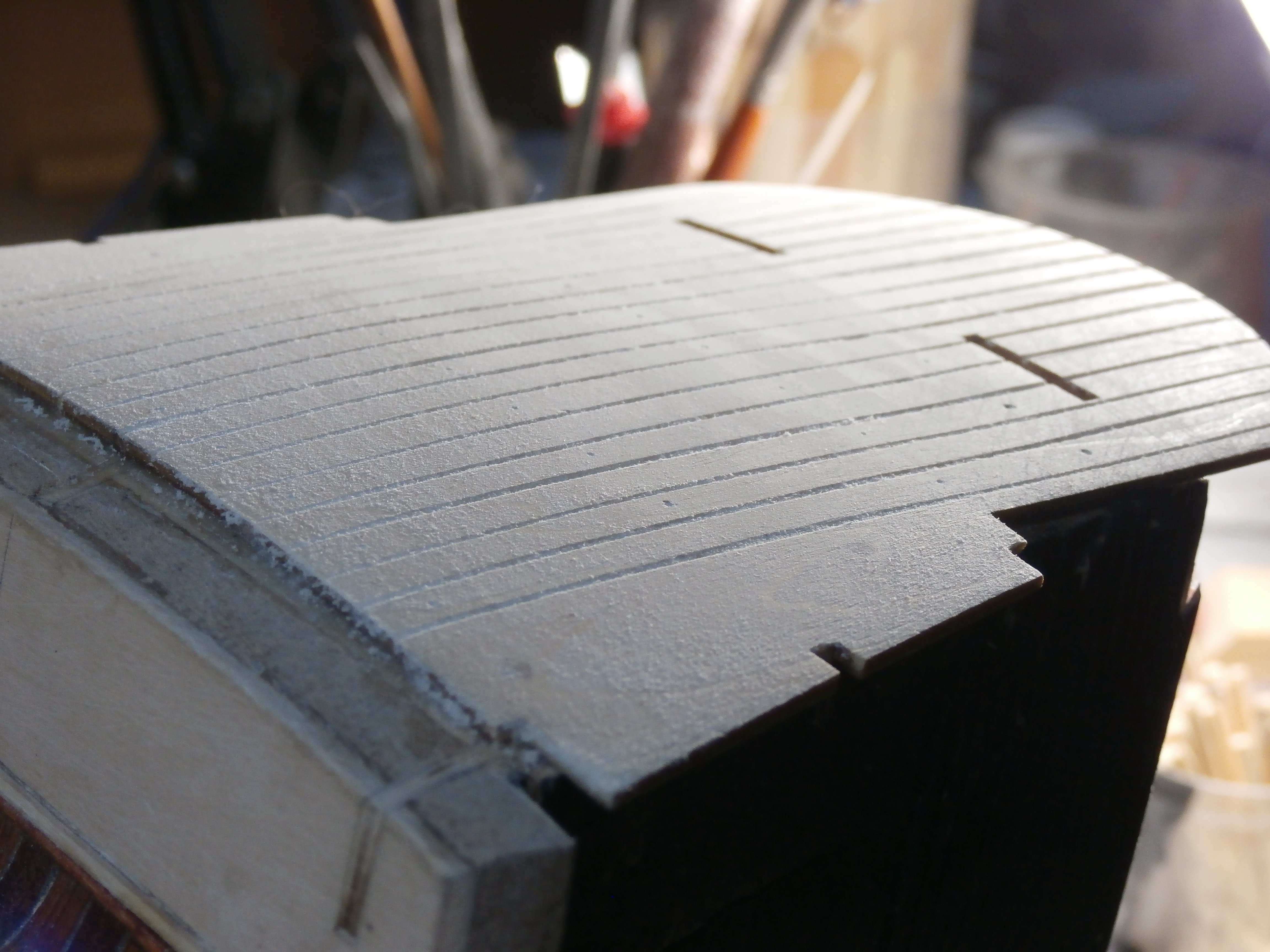 Как писал ранее, для утяжеления корпуса модели, что бы понизить центр тяжести и для надежного крепления разного рода уток, обушков и т.д.стоячего и бегучего такелажа модели, укладываю черновую верхнюю палубу из напиленных 10 Х 10 реек просушенной горной ели. (Это задняя дека старого, негодного пианино). По верх будет наклеена фирменная фанерная палуба патворка, а уж по верх уложены будут рейки палубного настила. Для того, чтобы защитить корпус от пыли нанес первый слой морилки. Морилка цвета "Эбен".