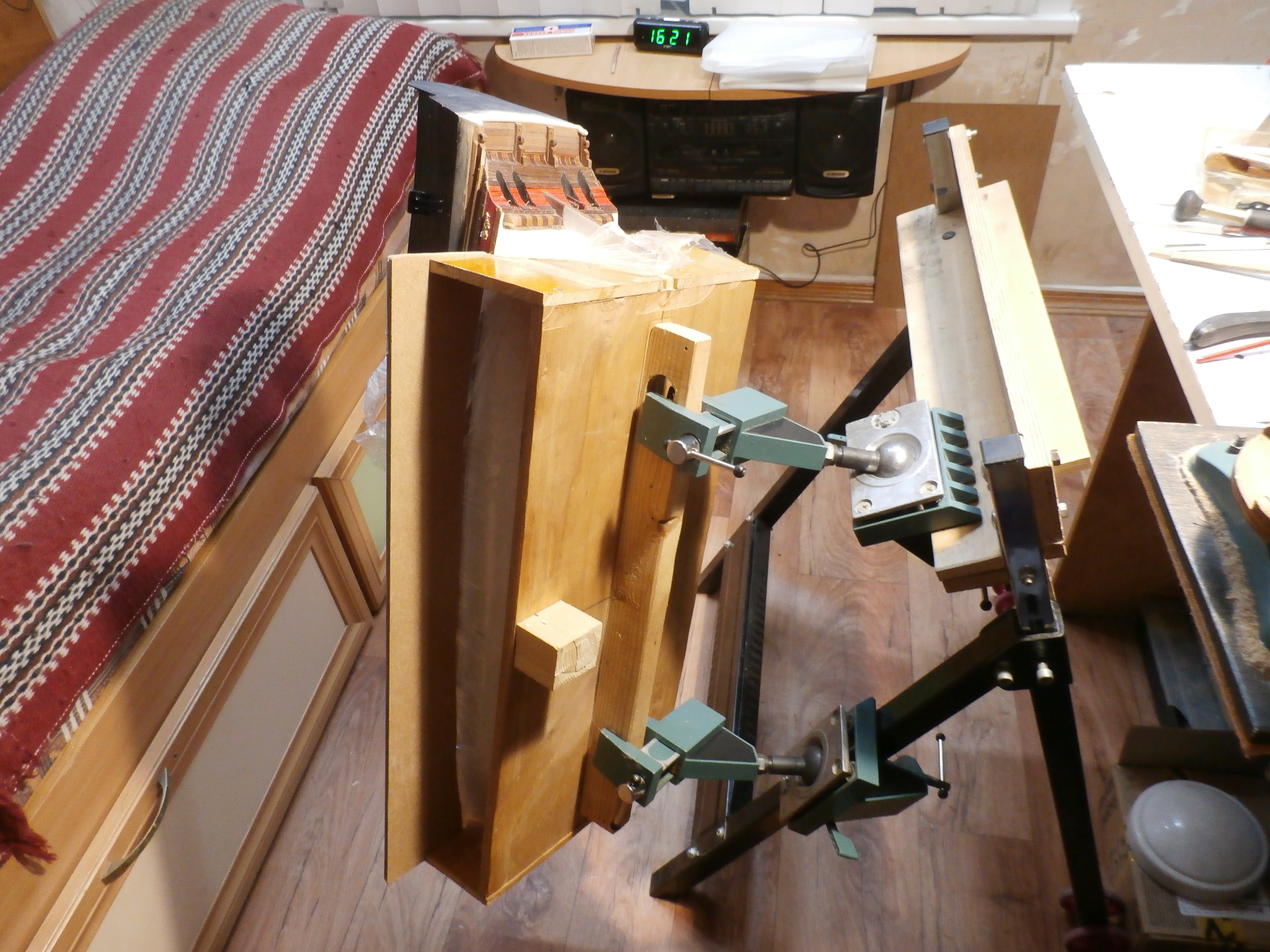 В своё время для удобства работы с моделью я собрал такую конструкцию из старого, неисправного, китайского верстака. На ножках верстака я укрепил колесики и двое тисков на шаровых шарнирах. Вся конструкция позволяет мне перемещать быстро и под любым углом корпус модели как вертикально, так и горизонтально, что, согласитесь для меня удобно. Тем паче что корпус у меня получается довольно тяжелым.