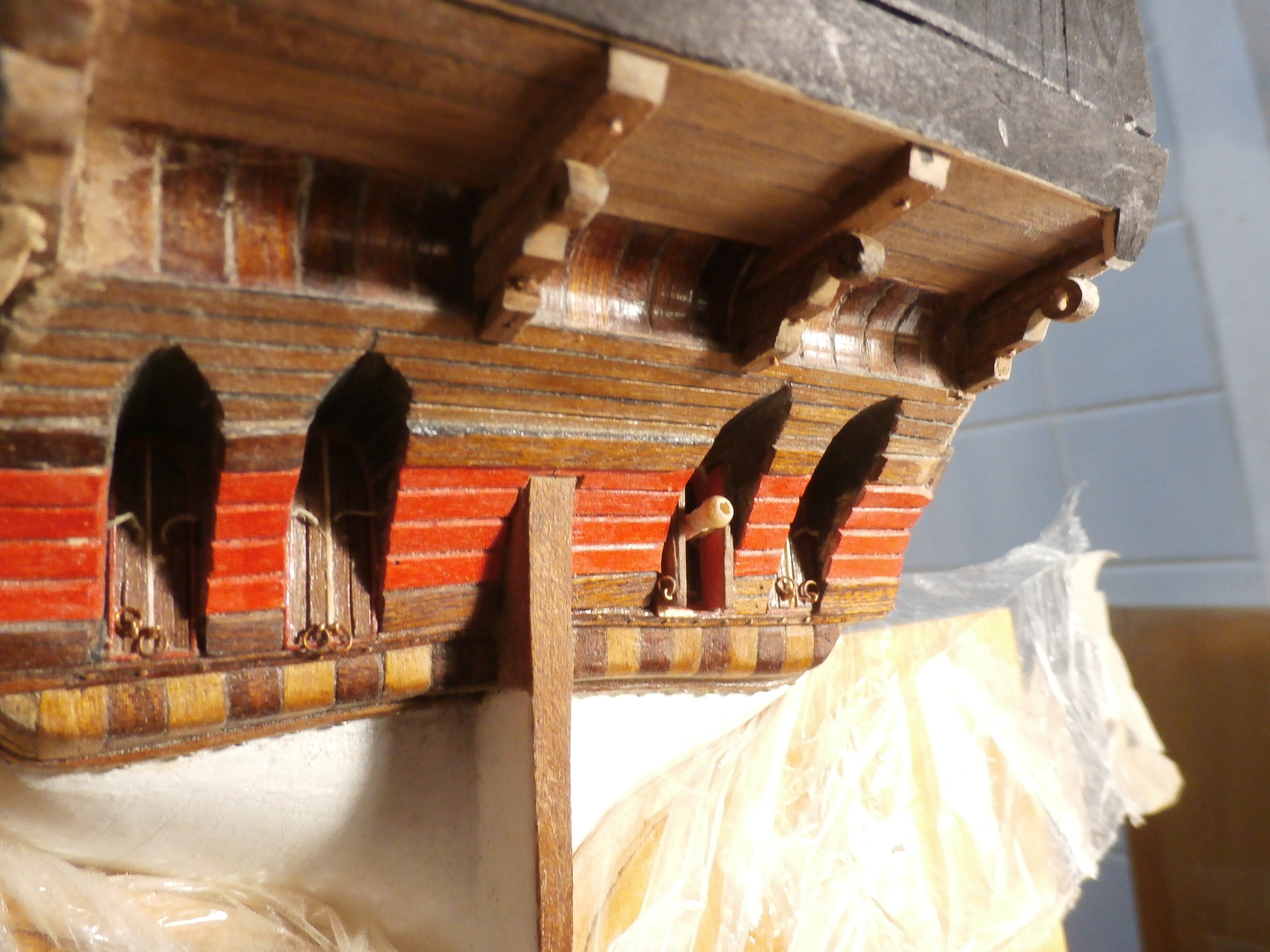 Спасибо за вопрос. Черновую обшивку своего Повелителя я вел теми же березовыми рейками которые присылали в патворке с журналом. Чистовую обшивку же я производил 3х 0,5мм рейками ореха выписанными в интернет магазине. Мне нравится орех. Эти рейки по своей окраске и фактуре очень напоминают потемневшие от времени и солнца старые и добротные доски борта парусника. Наш масштаб модели (1 : 84) вполне позволяет глубоко в имитацию конопатки не нырять. Имитацию конопатки досок обшивки гон и мидель - деков я проводил перманентным черным маркером, что , по моему мнению вполне достаточно. Все я это написал довольно подробно в шестидесятых страницах моей веточки. Мы знаем, исторически в задании короля Карла I о строительстве "Повелителя морей" что будущий флагманский корабль будет оформлен в черно- золотистых тонах. По этому верх моей модели будет в черном цвете, а значит имитация конопатки между досками чистовой обшивки в верху и на том же гакаборте просто будет бессмысленная. Черный цвет верхних реек чистовой обшивки я окрашивал при помощи спиртовой морилки цвета Эбен в трудных местах подкрашивая кисточкой китайской тушью. Удачи Вам и конечно Здоровья!