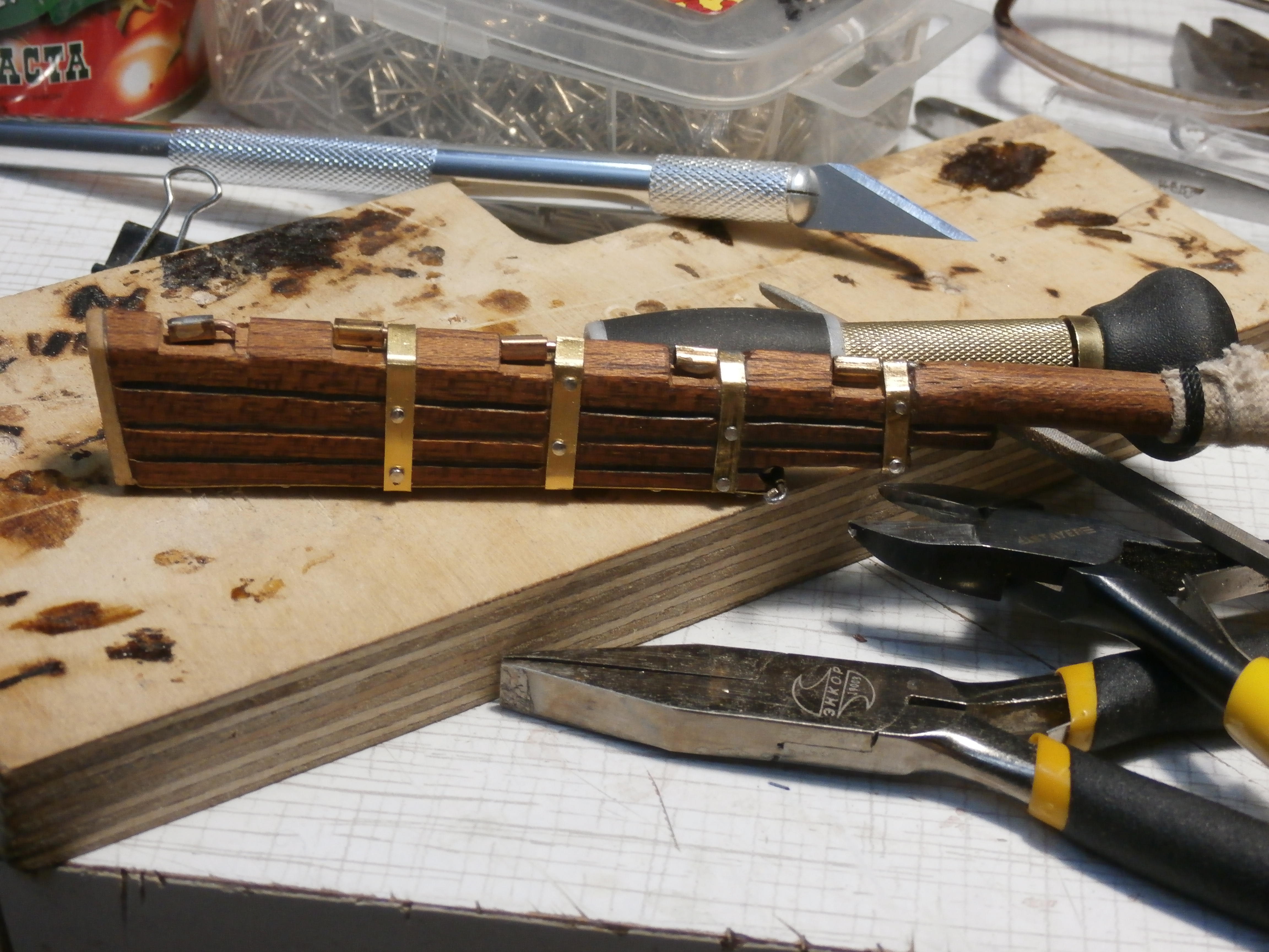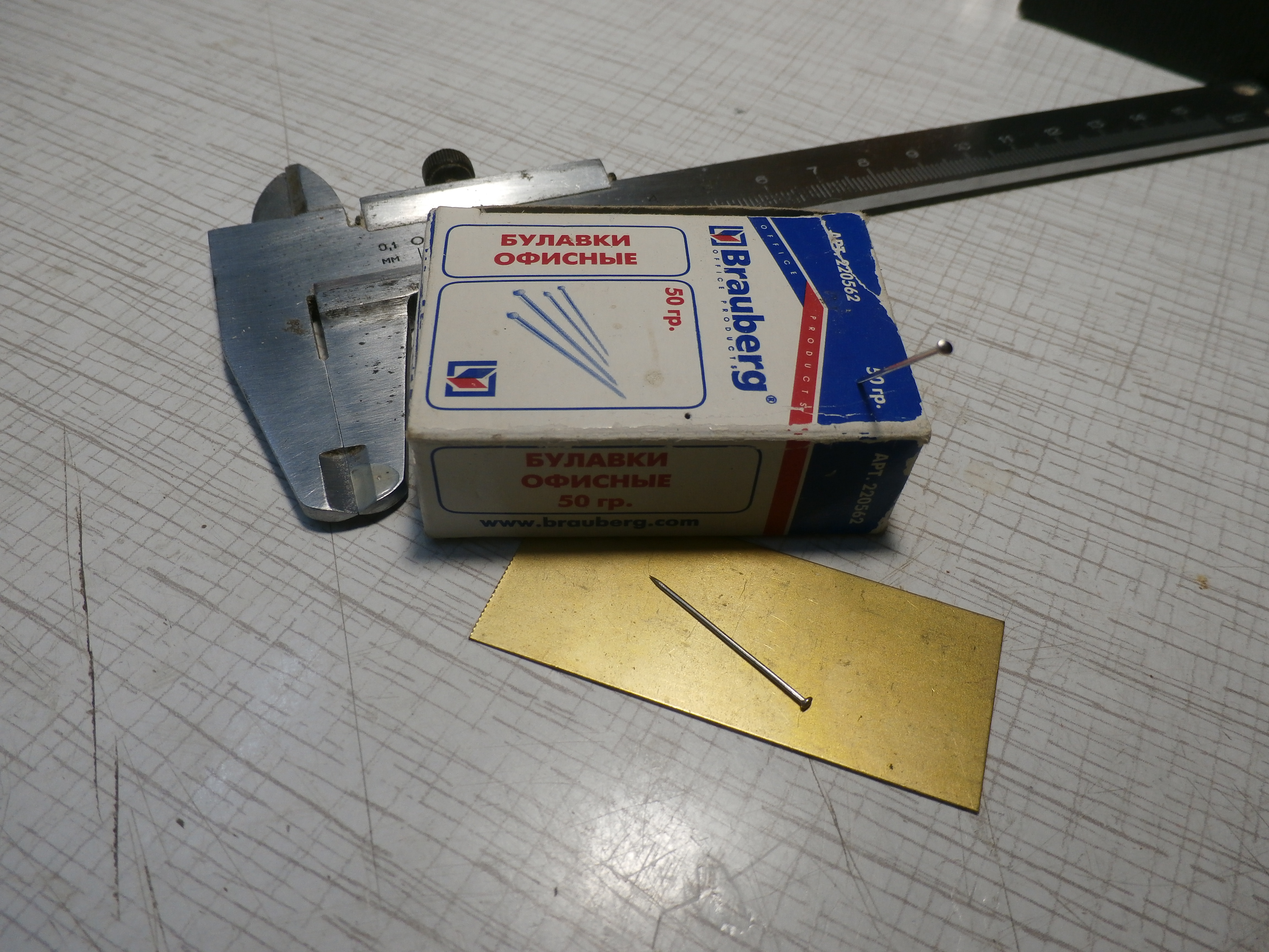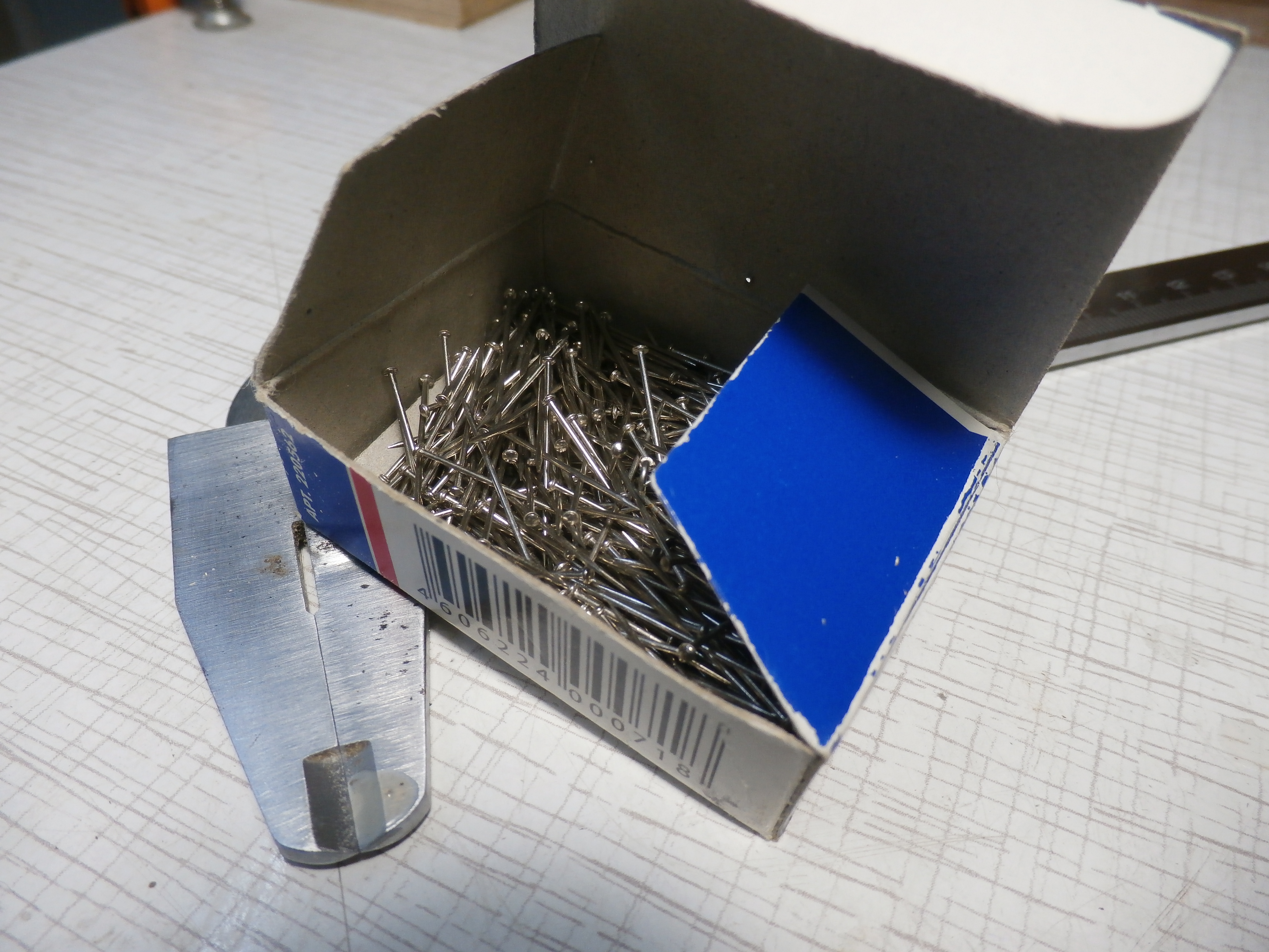 Для декоративного оформления модели, особенно корпуса корабля очень подходят офисные булавки продающиеся в магазинах канцтоваров. Булавки не дороги, Я купил за 34 рубля, рассчитываю прикрепить ими петли корабельного руля. Булавки изготовлены из нержавейки , легко режутся обычными малыми, модельными бокорезами.Головка булавки выпуклая, круглая очень похожая на стальную клепку в миниатюре. Удачи Всем и хорошего настроения!