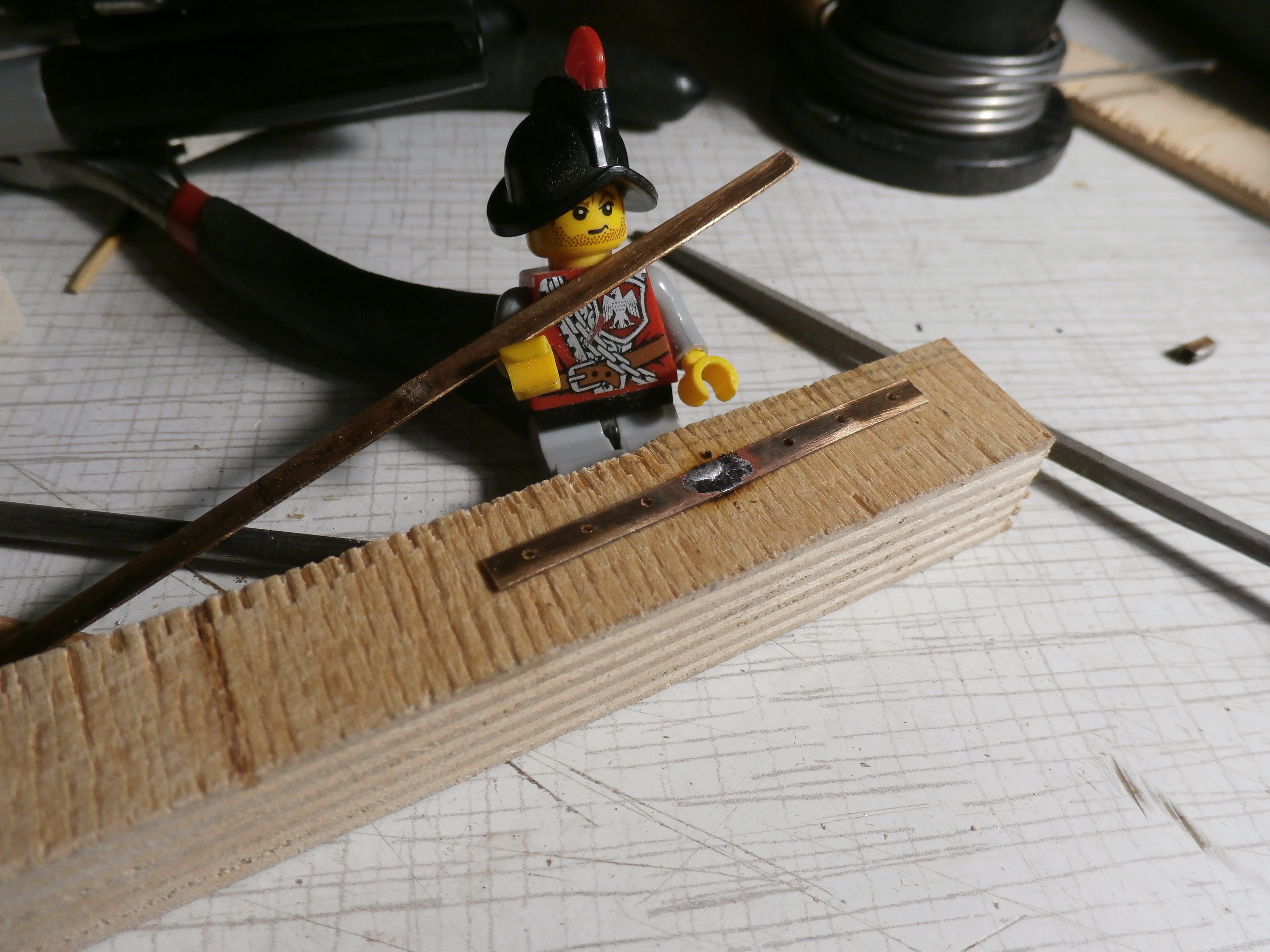 "Повелитель морей". Работы веду в кормовой части корпуса по подвеске пера руля на корабельные петли. ( Вторая часть) Первая часть - петли (папа) на пере руля у меня были установлены ранее. Сегодня закончил изготовление второй части петлей (мама) которые будут закреплены на ахтерштевне корпуса модели. Латунные полоски, присланные для петель патворком я увы потерял! Долго искал, но увы так и не нашел, решил изготовить свои. В моих запасах есть не большая полоска латуни толщиной в 0,5 мм. Из этой полоски я зубилом отрубил полоску шириной 3 мм. Края сточил мелкозернистым (бархатным напильником) Получилось не хуже фирменных петель. На месте сгиба подтачивал мелким четырехгранным надфилем, чтобы метал чувствовал и охотней сгибался именно там, где мне нужно.