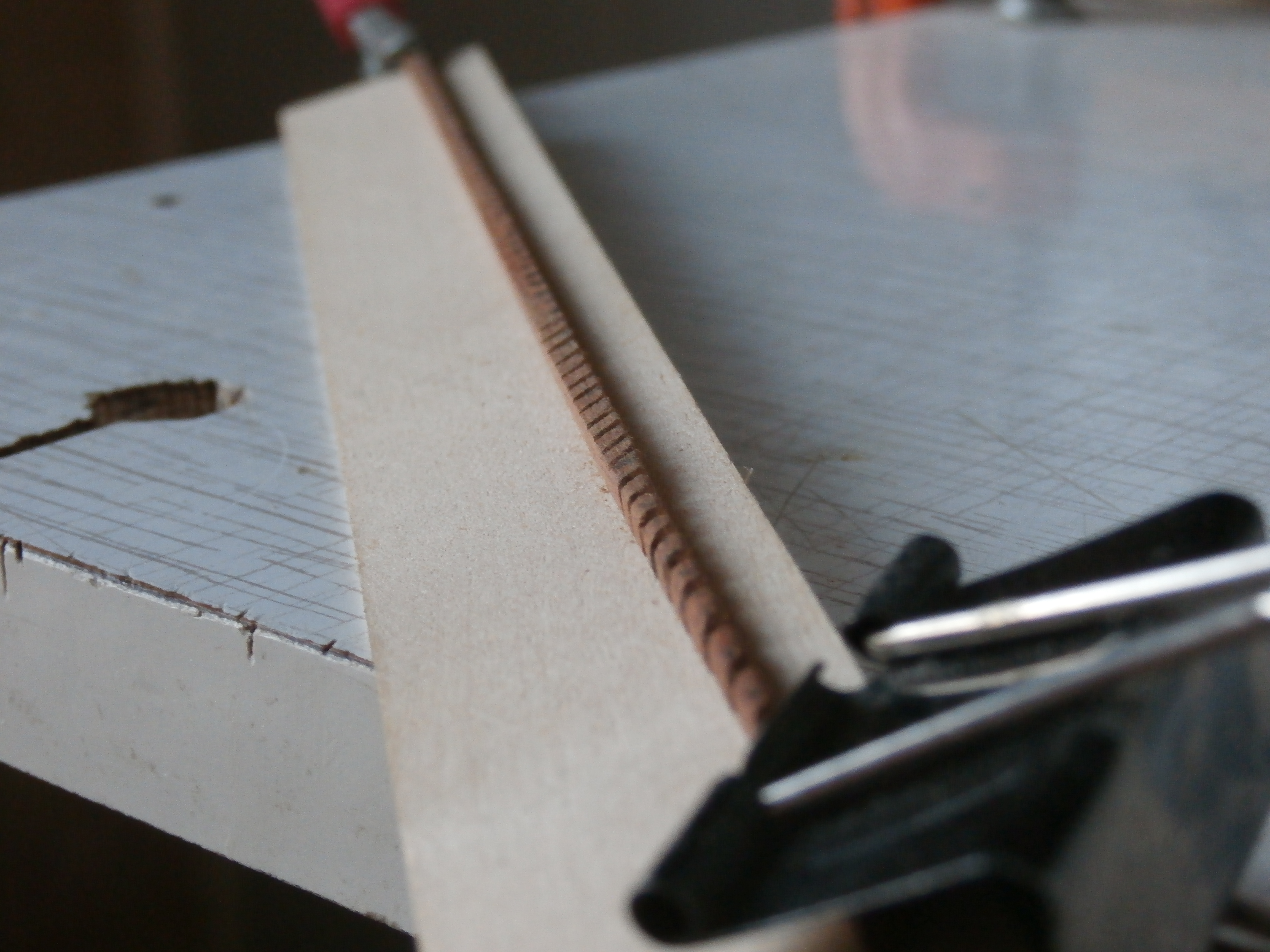 На микроциркулярке нарезаны 2 Х 1,5 мм реечки. так как выбор не велик нарезал рейки из березы и ясеня, опробовал. Лучше получается - из ясеня. Попытка первая. Резать даже очень острым ножом - не получается: подводят глазки да и слаба моторика рук. Перешел на надфили. Дело пошло, но стальные надфили сразу забиваются опилками, перешел на алмазные надфили... Судить вам мои читатели. Расстояние между витками воображаемой веревочки 5мм. Темно- шоколадный цвет ясеня будет хорошо смотреться на белом фоне березовой планки если по - верх покрыть матовым лаком, думаю и попробовать обработать декоративным маслом. ( у меня есть не много тунгового масла ) Попробую и шеллак. Если нужна будет "золотистая верёвочка", предварительно нужно будет покрыть грунтовкой ну а после уж золотистой... Мне на праздник моя молодежь из Москвы привезла жидкую патину. Есть возможность поэкспериментировать