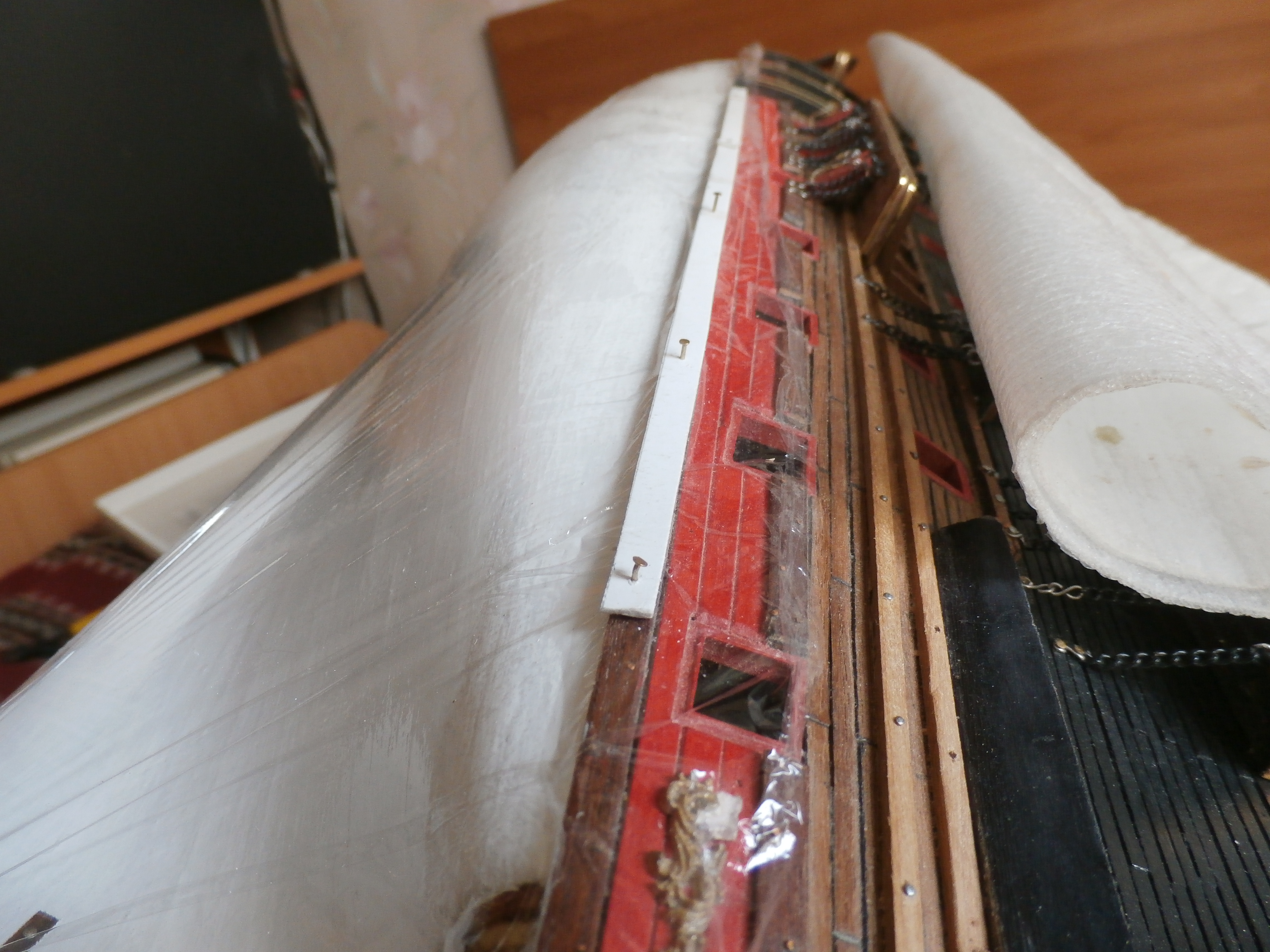 Верфь работающая на моём письменном столе продолжает свою работу. Прошло трое суток, как я покрыл последним шестым слоем акриловой белой краской борта и днище моего корабля. Пора моему кораблю , вернее корпусу модели, в её рабочее стойло, на её строительные киль-блоки. Но перед этим нужно как то обезопасить корпус модели , по крайней мере ниже ватер-линии от разных превратностей строительства: пыли, сколов и царапин и т.д.