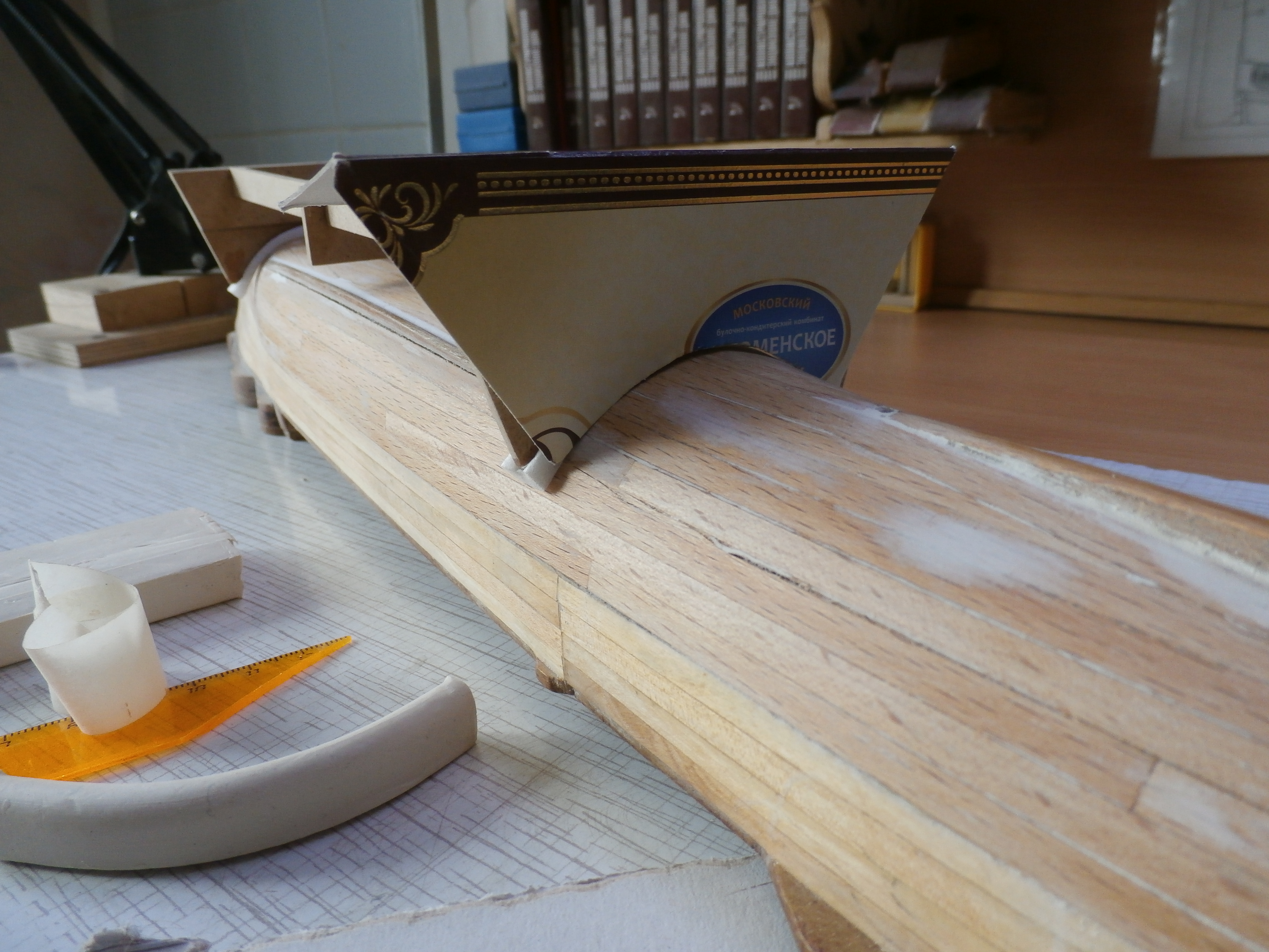 здравствуйте Сергей Николаевич , спасибо за подробное письмо и за фотографии как делать, у меня такая же - керамическая масса для моделирования и лепки в упаковке и упаковка массы небольшая, высылаю в перейди своего письма фотографию этой массы , меня интересует при вскрытии упаковки - сама масса квадратная и небольшой длины , можно эту массу когда разминаешь немного удлинить по длине, чтобы хватило длины для обхвата по корпусу корабля от килевой основы корпуса и на изгиб небольшой от киля и по овалу корпуса - по правой стороне и по левой стороне корабля и длину овала делать - до ватерлинии корабля - не доставая - 20 млм и перед тем как массу положить на корпус корабля - как на Вашей фотографии , я вначале положу на корпус пищевую полиэтиленовую пленку вырезанную на полоски по всей длине корпуса с правой стороны на левую сторону , а потом на пленку положу эту полоску из массы для высыхания массы на самом перевернутом деревянном корпусе как на Вашей фотографии и оставить массу на корпусе для высыхания и затвердевания на сутки - это для носовой стороне корпуса, и то же самое сделать так же на кормовой стороне корабля , можно эту массу удлинить по длине овала , что бы хватило массы на 2 стороны - правой и левой стороны корпуса корабля, с уважением к Вам Юра, добра и здоровья!
