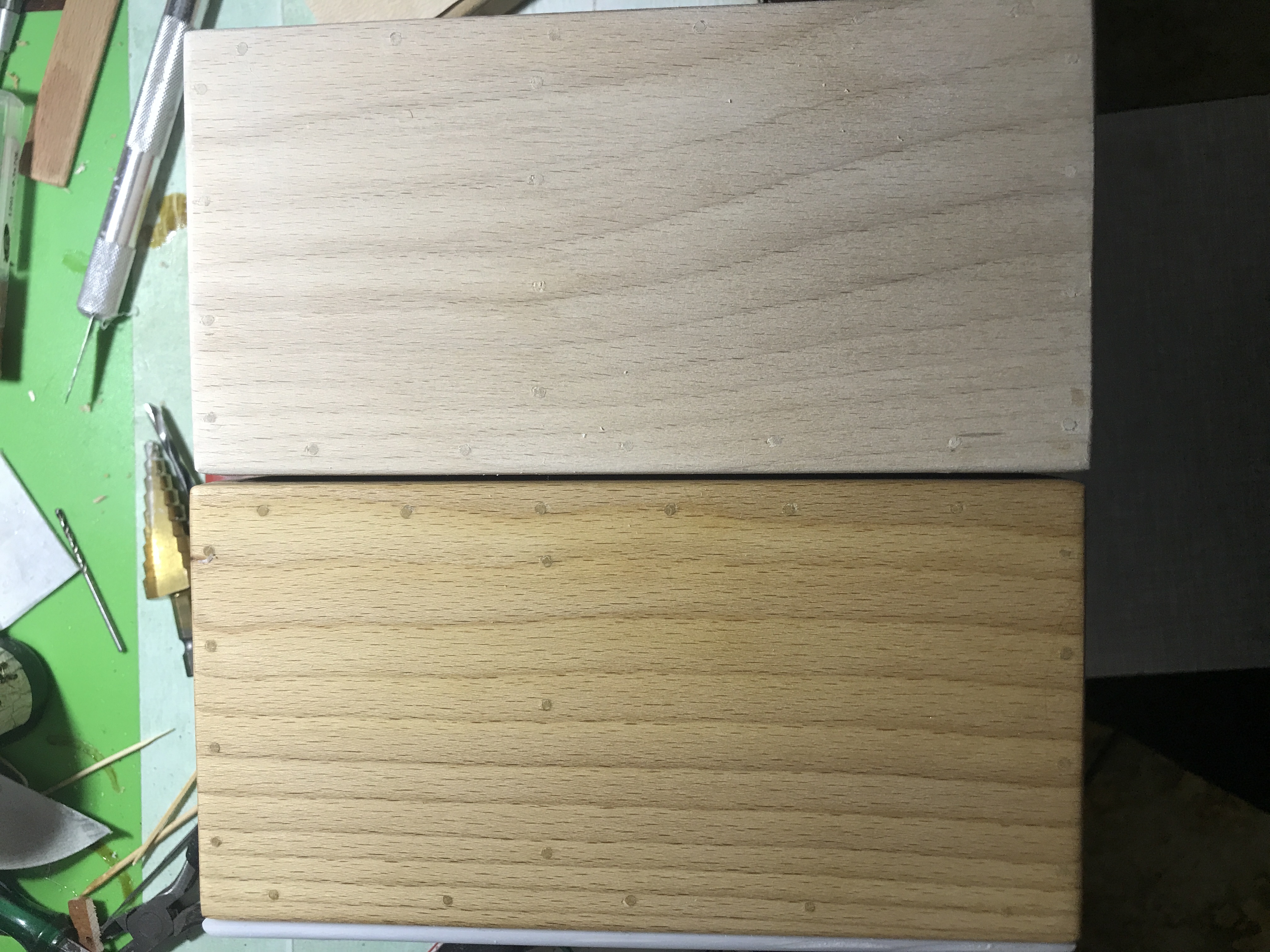 На фото два буковых корпуса. Один пропитан льняным маслом, второй нет. Темные точки это березовые зубочистки
