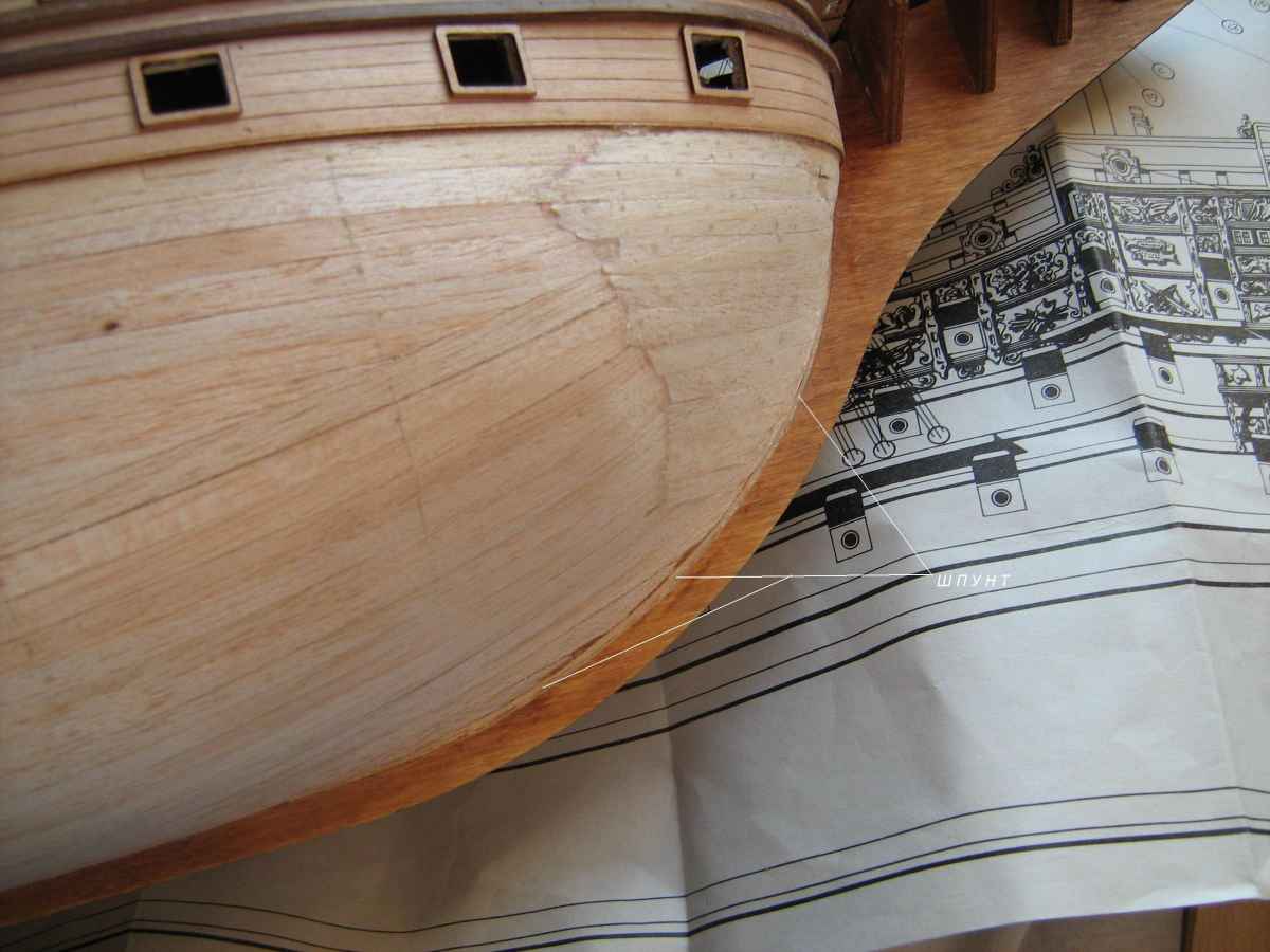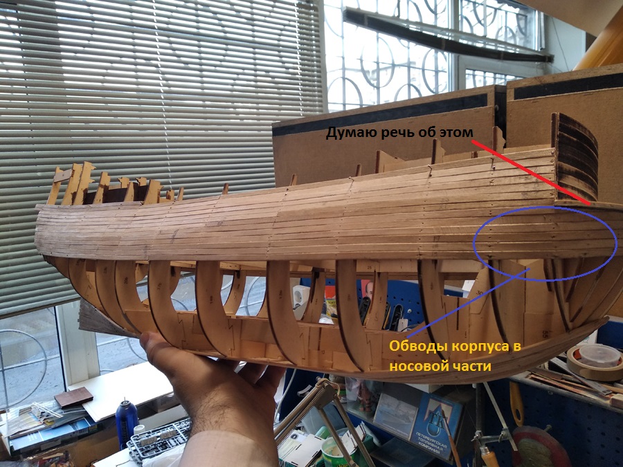 Носовая часть корпуса у деа получается, не знаю как описать,"худой" что ли. По идее обводы корпуса в носовой части должны быть более полные(пузатые). Я клеил планки на торцы шпангоутов, хотя спасло мало. Вообщем носовую часть нужно корректировать. Можно и после черновой.