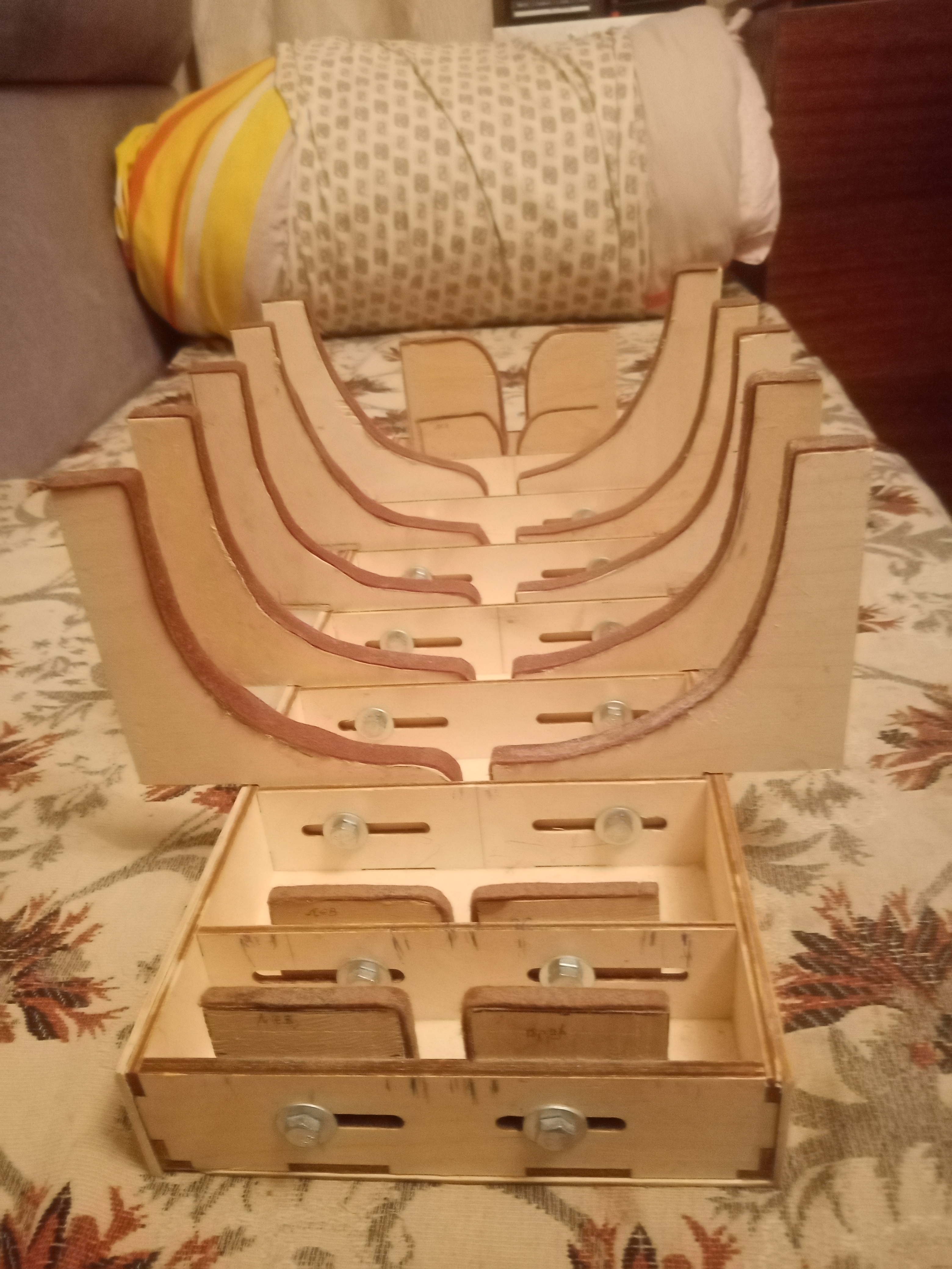 Добрый день уважаемые моделисты и участники форума о постройке корабля - Повелитель Морей - , моя верфь на рабочем столе продолжает свою работу , на своем стапеле к корпусу корабля - Повелитель Морей - сделал фанерные боковые стойки , полный набор стоек с изгибом - обхватом как на шпангоутах утолщаю сделанные стойки фанерой по бокам стойки - обвожу как лекало стойки и выпиливаю и на клей ПВА приклеиваю и на зажимы скрепляю , делаю толще стойки боковые , еще нужно боковой изгиб обшить 2 ным фетнэром , чтобы не заоераши стойки корпус корабля , сделаю свой стапель пришлю фотографии стапеля с корпусом корабля , с уважением Юра добра и здоровья и всего хорошего