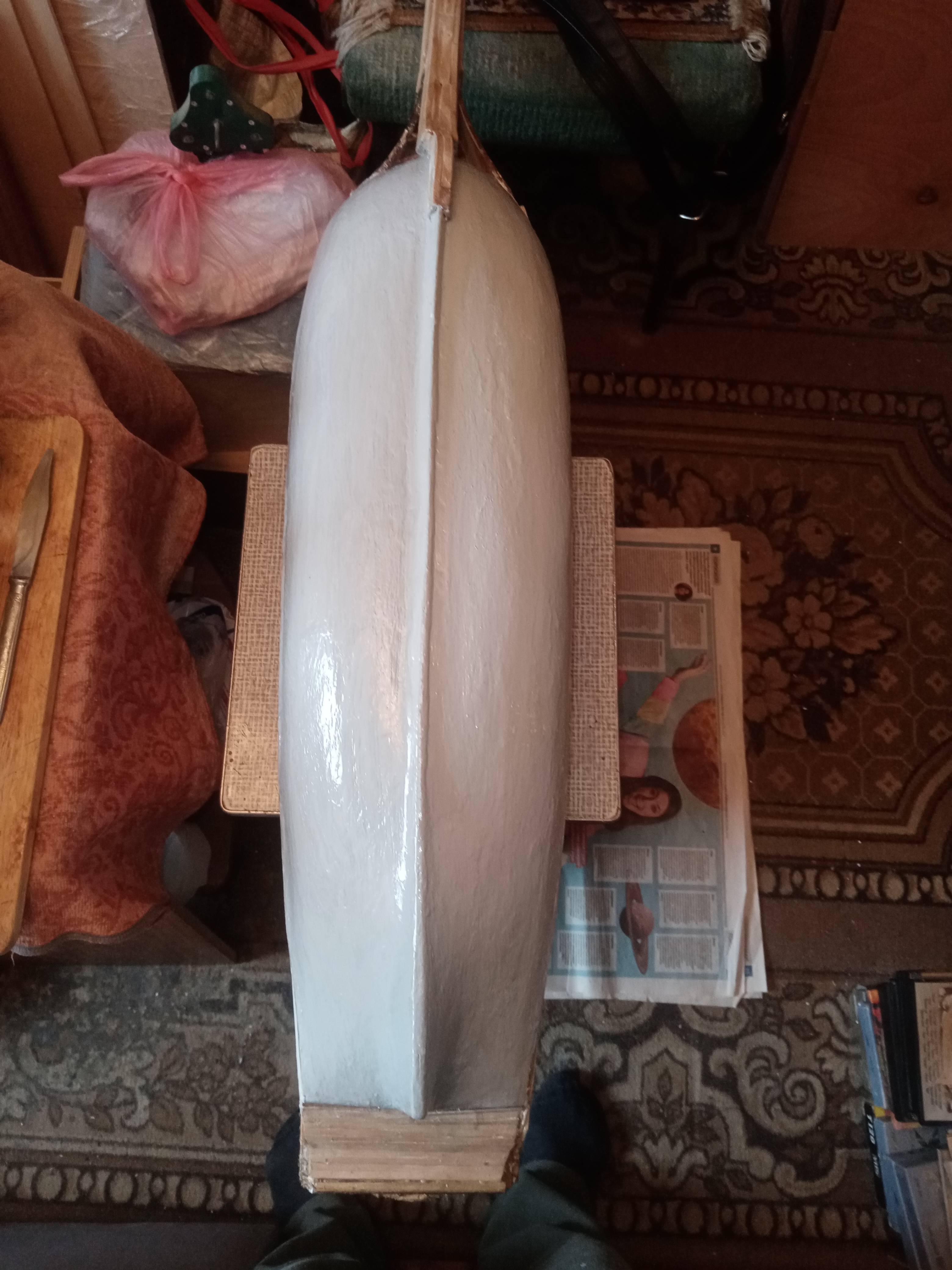 Доброе утро уважаемые форумчане и моделисты участники форума о постройке корпуса корабля - Повелитель Морей - спасибо Вам С. Н Керва за ответ на мою веточку о постройке корабля , у меня корпус корабля - Повелитель - пока стоит на пенопласте временной подставке - покрашенный корпус корабля краской акриловой с сероватым оттенком , что бы не царапать и не портить покрашенный корпус корабля , я нашел 2 целлофановых длинных пакета и пакет от коробки, которую на почте заворачивают в посылку - длинный пакет и широкий , взял для того что бы подложить на временную пенопластовый короб - подставку и обернуть покрашенный корпус корабля широким и длинным пакетом от коробки и безопасить покрашенный корпус от сколов и не повредить краску на корпусе , теперь можно установить обернутый этим пакетом корпус корабля на свою рабочую подставку - стапель и в внутрь стапеля положить целлофановые длинные 2 пакета и обклеивать весь корпус от ватерлинии и до верха палуб и перил корабля укреплять корпус корабля - 2 ным черновым шпоном рейками , для дальнейшего - обчерчивать недостающие порты на корпусе и вырезать острым лезвием ножа и сверлить тонким сверлом , а маленький корпус корабля - Авось - нужно еще раз обшить чистовой обшивкой - 2 ным шпоном рейками цвет - Анегри - этим и буду заниматься в выходные дни , с уважением к Вам Юра и всего хорошего , здоровья и успехов в моделировании и Ваших делах