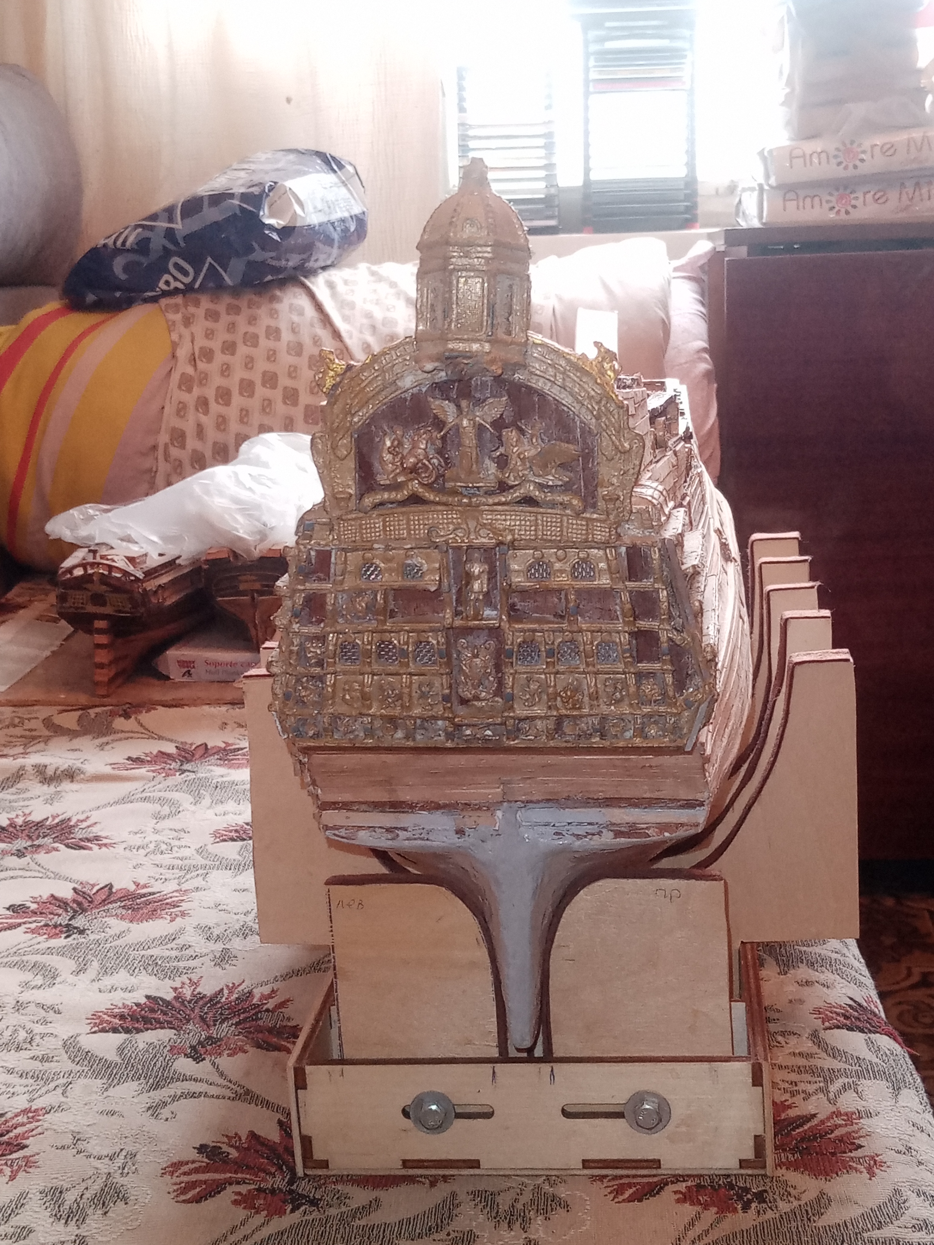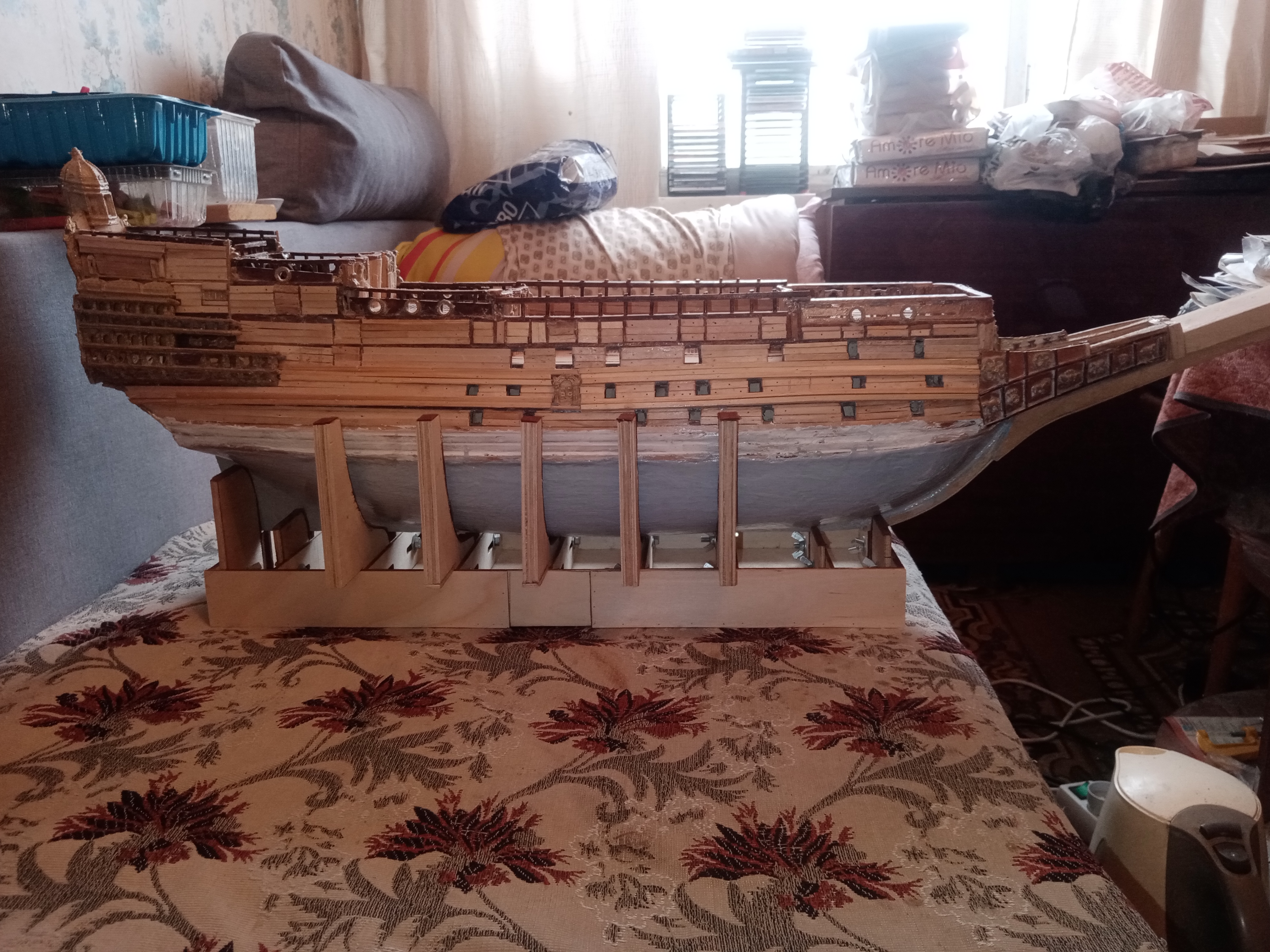 Добрый вечер форумчане и коллеги иоделисты и участники форума о постройке корпуса корабля и всего обустройства деталей на данной модели - Повелителя Морей - С уважением к Вам Керва С. Н. , я когда покупал в розницу в журнальном киоске со оюз печати с 2017 - 2018 г почти до 2019 г все номера с 1 - по 135 сохранены у меня вместе с деталями для постройки корабля , моя домашняя рабочая верфь продолжает свою работу , с журнального столика освобождаю все свои предметы , ноутбук и так далее.... на свой диванчик - софу перекладываю , оставляю только разложенную скатерть - материю в 2 слое и ставлю свой рабочий - старепель подставку для корпуса корабля , на стапель укладываю временно материю 2 ную от почты , этой материей обворачивпют посылки , и ставлю сверху свой корпус корабля на стапеле удобно заниматься реконструкцией своего корпуса корабля, прошлую субботу на правой стороне корпуса обшил черновым шпоном - рейками необшитые места корпуса с середины корпуса на клей пва и на мелкие гвоздики сверху реек забивал молоточком средним и на 3 верхней палубе где обшит тонким шпоном рейками решил укрепить корпус корабля фанерой - 3 млм , эта фанера в виде планшета покупал в маг Леонардо - все для моделей и рукоделей есть в наборе , снимал размеры с корпуса корабля и до кормовой части корпуса - где присутствуют балкончики с каютами для экипажа и приклеенные средние фонарики, только шпон черновой - рейки тонковато смотрятся вот и решил укрепить свой корпус корабля а местах где средняя палуба с вырезанами портами для пушек , решил не тратить лишний раз покупая черновой шпон - рейки укрепить основание корпуса этой фанерой , для этого с помощью очередного листа - картона разметить на листе рисунок 2 палубы вместе с портами и перенести на фанеру и выпилить, а на 3 палубе я приклеил квадратные - обрезки и 4 палубе где посмелее большой фонарь и по бокам корпуса на корме тоже будут приклеиваться небольшие боковые фонари средние, я эти места укрепил фанерными отрезками обводя маленькие 2 боковых фонарика приклеенные на корме , решил укрепить фанерой, и с средней палубе где обшита корпус фанерой , с верху фанеры приклеивать черновой шпон - рейки, а на 2 палубе где начинается основание киятвигера и где приклеиваются якоря корабля укреплять корпус корабля черновым шпоном - 2 нами рейками до приклеенной на 2 палубе обшитой фанерой и сверху одним слоем черновым шпоном рейками и так до самого низа ватерлинии корабля укреплю корпус черновым шпоном - 2 нами рейками и это на правой стороне корпуса реконструкция укрепления корпуса и на левой стороне корпуса тоже самое сделаю , ка на правой стороне корпуса. А потом можно пленкой пищевой 2 ным слоем обернуть низ корпус корабля от ватерлиннии одо килевой основы корпуса корабля продольной рейки с правого и до левой стороны корпуса корабля и на рейки длинные из картона или оргалита и на гвоздики прибить, обезопасить корпус покрашенный краской , с уважением к Вам Юра добра и всего хорошего , здоровья и всего благ и удачи во всем