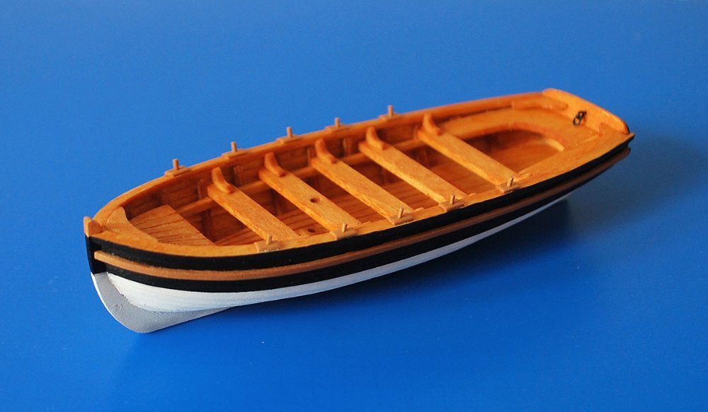 Доделал крепления для весел в шлюпке. Пустил по борту отдельную рейку из груши, т.к. то, что предлагали делать в журнале шейпером, не понравилось. По задумке шлюпка должна отражать цветовую гамму корабля - белый низ, черный верх. Окрасил шлюпку снаружи акриловой краской, внутри акварелью и сверху покрыл маслом.