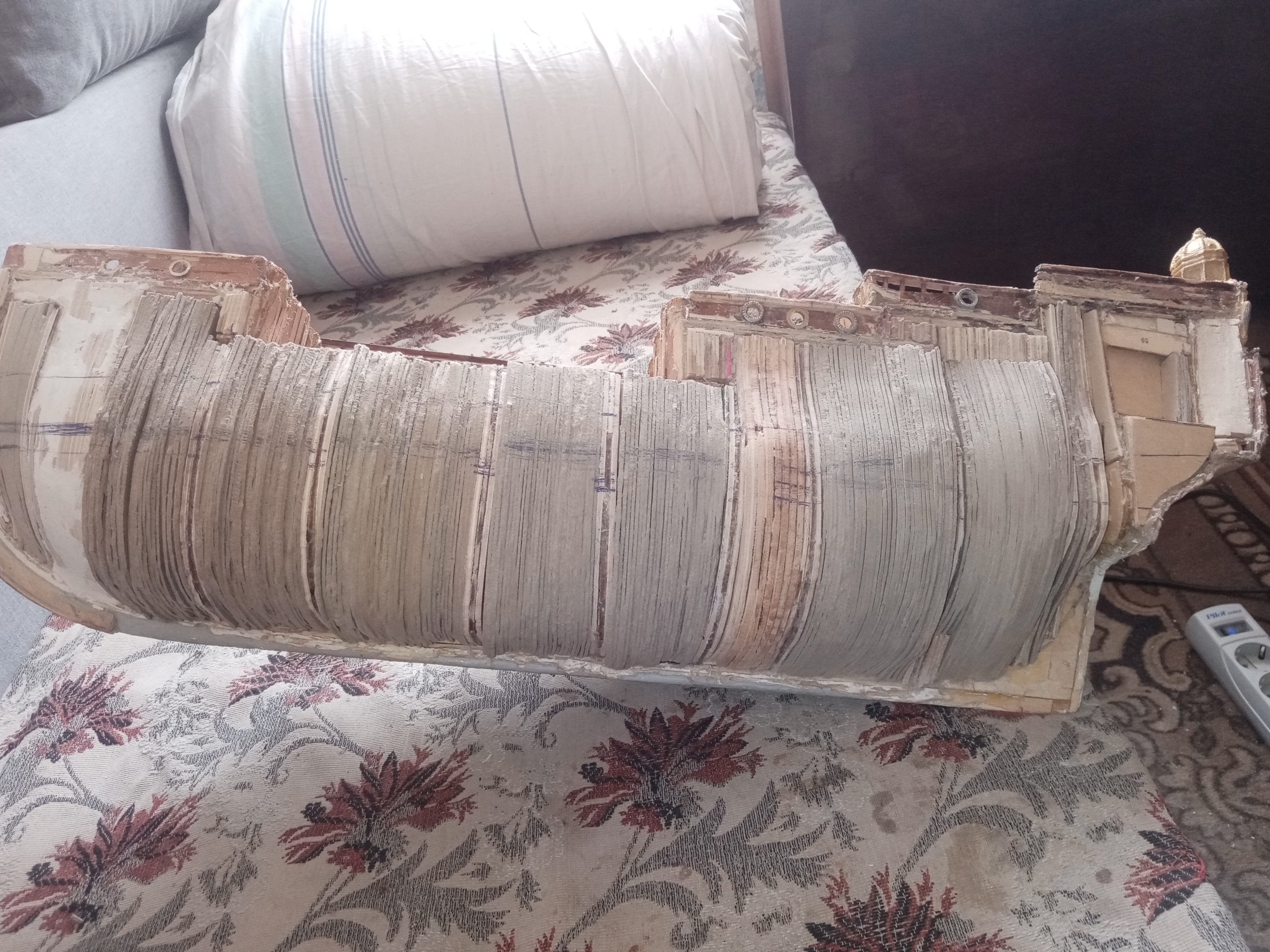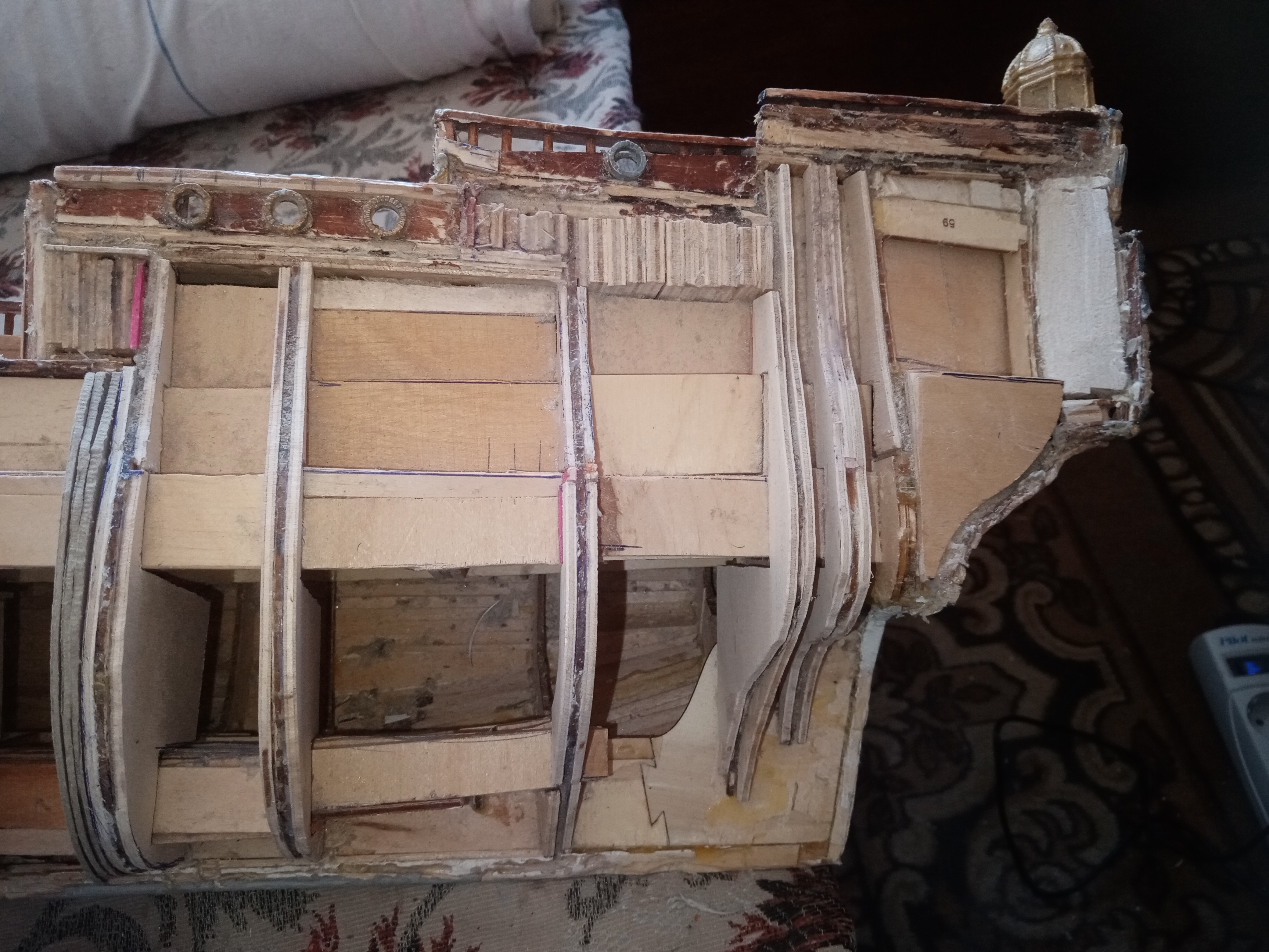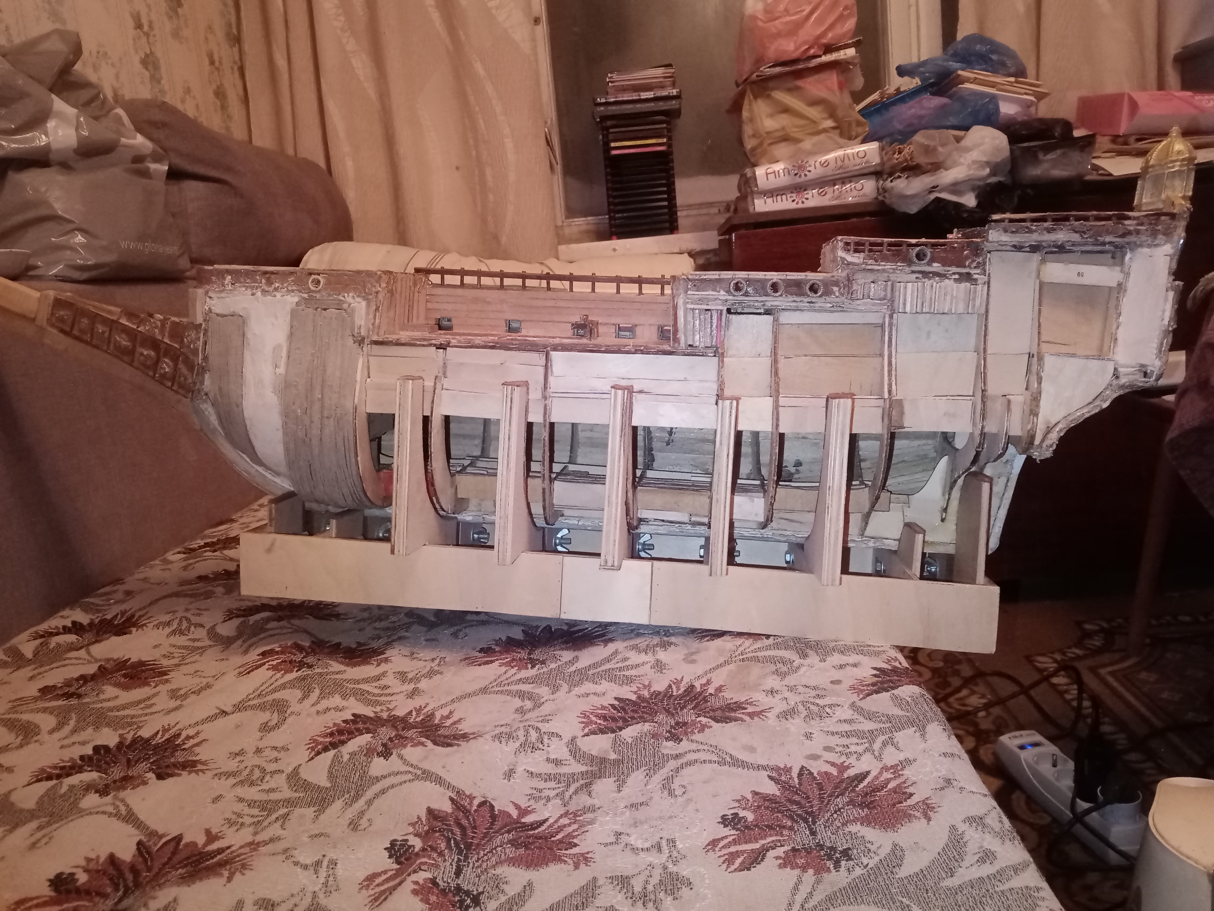 Ваши работы по перестройке корабля впечатляют, но я должен предостеречь вас, о том что вы слишком , по моему мнению увлеклись по заполнению шпаций ( расстояний пустот между шпангоутами в корпусе модели) листами картона и МДФ.Да , я не сомневаюсь в результате чего у вас получится очень крепкий и монолитный корпус модели. Но мне кажется вы упускаете из вида, что выше ватерлинии у корпуса модели должны быть расположены порты артиллерии вашего 100 пушечного корабля! В вашем монолитном корпусе в будущем будет очень сложно выдалбливать эти порты... Как я понимаю, вы решили вести постройку корпуса модели по моему варианту. Но я заполнял древесиной шпации от киля и ТОЛЬКО до ватерлинии! Вернее до гон-дека моего корабля! За тем в оставшиеся пустоты гонд-дека я вставлял будущие арт.порты моего линейного корабля...