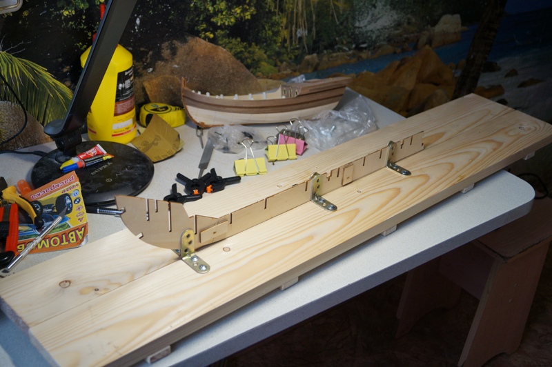 Вас не много обманули назвав вашу подставку - стапелем. Глупо ругать то, что уже куплено. Это ( ваш стапель) возможно в будущем будет для вас хорошей рабочей подставкой. На ней будет прекрасно себя чувствовать корпус когда вы будете изготавливать мелкие детали корабельного оборудования и крепить эти детали на верхней палубе и бортах модели... Но наша задача сейчас изготовить сам корпус. Изготовить так что бы у корпуса от высыхания клея (кристаллизации) не повело киль в право или в лево. Для этого нужно как то очень жестко закрепить киль к прямой и жесткой конструкции. Вот как это делали наши с вами коллеги (Романтик и Анатолий Осипов) Фотографии из нашего ДеА сайта. Я думаю, что при изгибании киля во время высыхания клея ваш корабль будет просто выдавливаться в верх! Ведь в вашей рабочей площадке сама модель не закреплена жестко! Продумайте этот момент. Возможно можно привязать киль модели к полу вашего стапеля проволокой или крепким шнурком, просверлив в полу площадки несколько отверстий?. После высыхания клея во время заполнения пустот проволоку, шнурок или крепкие нитки можно просто будет отрезать?!