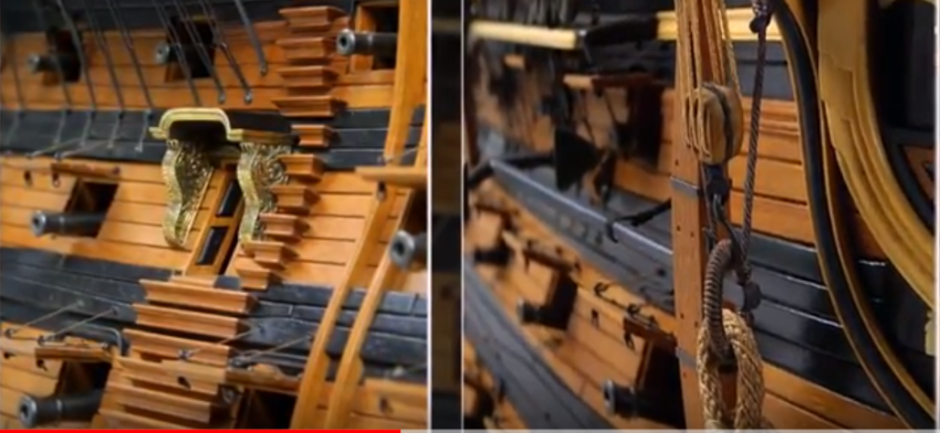 Толя, приветствую, а бархоут не широковат? Пропорции высоты пушечного порта и ширины бархоута по чертежу или рисунку де Вельде не прикидывал? Мы только фото видим, с искажениями в зависимости от ракурса,поэтому сложно судить. Ещё бы разметить положение остальных элементов в носу (клюзы, толщину кницы гальюна), чтоб ориентироваться.
