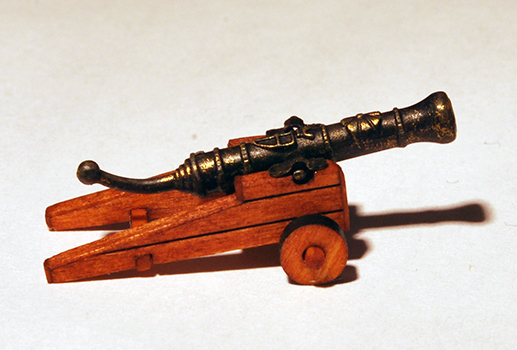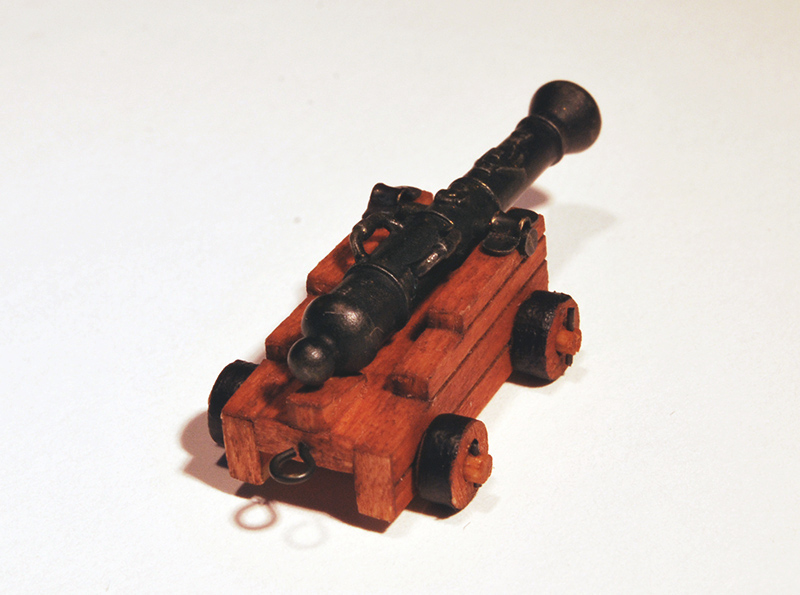 Вторая пушка готова. Тележка смотрелась очень широкой, поэтому пришлось заузить ее на 2 мм и подпилить цапфы орудия. Посмотрел здесь на форуме как делают клин у колеса лафета и решил сделать тоже, только из проволоки. Они вроде железные были. С рымами пока вопрос открытый - по журналу будут только подкатные и откатные тали, а брюк не предусмотрен.