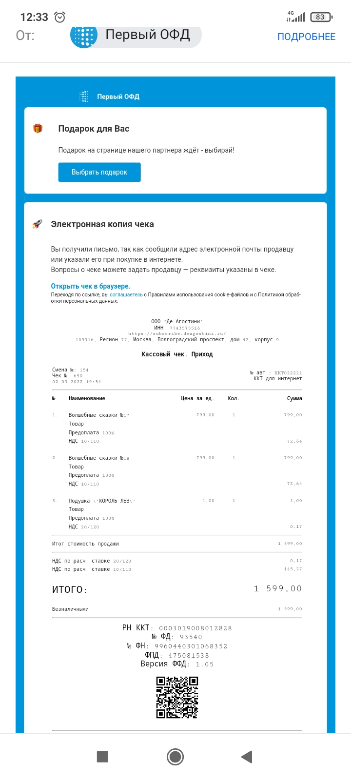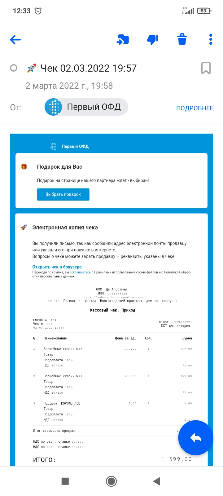 Все заявленные подарки подписчики обязательно получат. В личном кабинете вы можете посмотреть состав следующих посылок или уточнить информацию по номеру вашего заказа по телефону 8-495-660-02-02, 8-800-200-02-01 (пн-пт).Эльдар Фаридович Бирюков писал(а): ↑30 мар 2022, 11:26 Подскажите к выпуску №19 предполагалось футболка, по факту в посылке её не было.