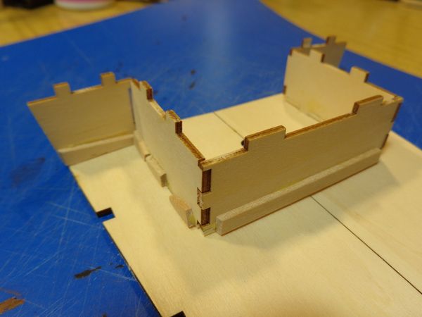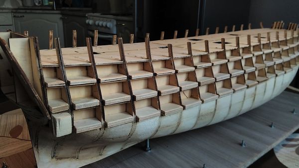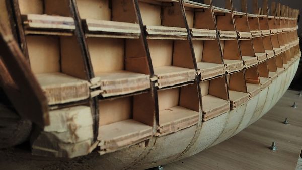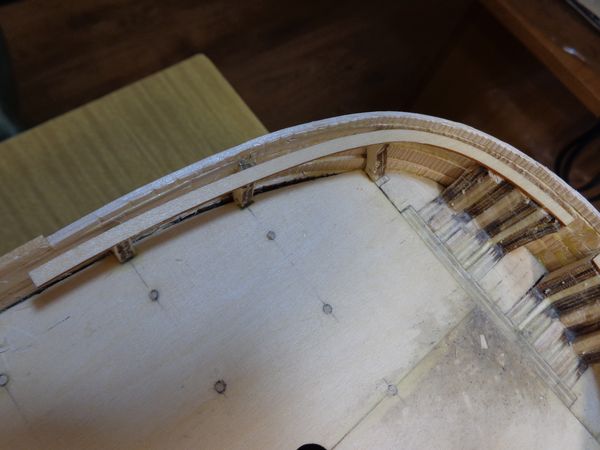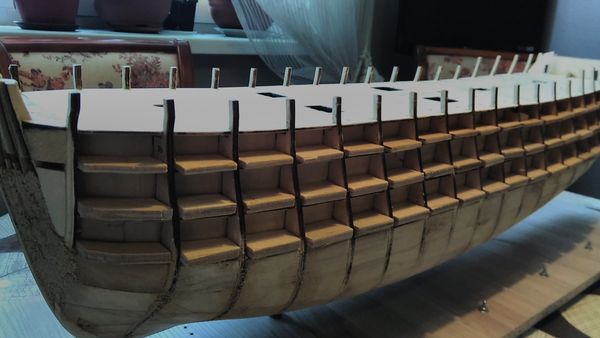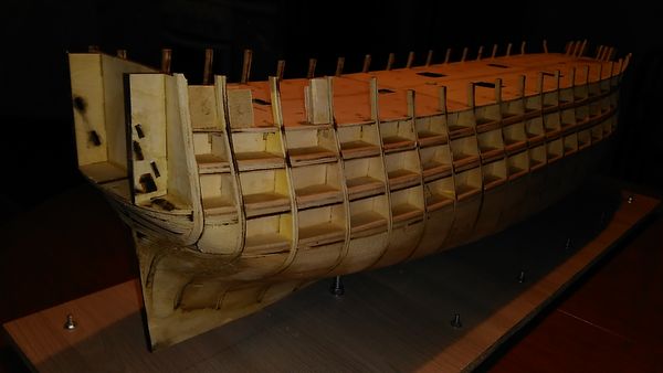 Следующий этап работ по сборке корпуса модели — усиление кусочками фанеры палуб гон-дека, мидель-дека и опер-дека в зонах примыкания к внешней обшивке с целью увеличения жёсткости корпуса, обеспечения лучших условий при укладке обшивки по криволинейным поверхностям корпуса, а также обеспечения приемлемых условий при закреплении внешнего оснащения (наружных трапов, крамболов, якорей, русленей и др.).